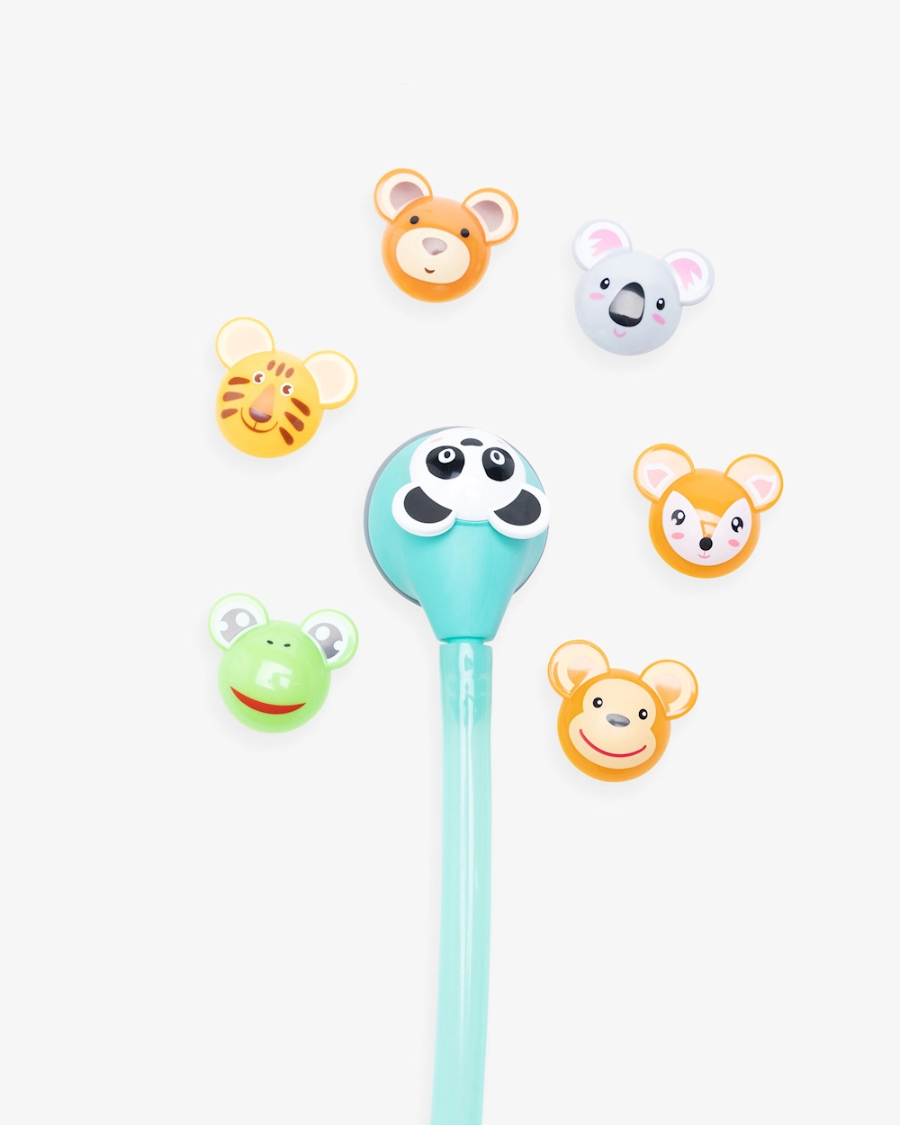 Syv dyr for å feste på bryststykket: Panda, koala, ape, bjørn, frosk, hjort og tiger.