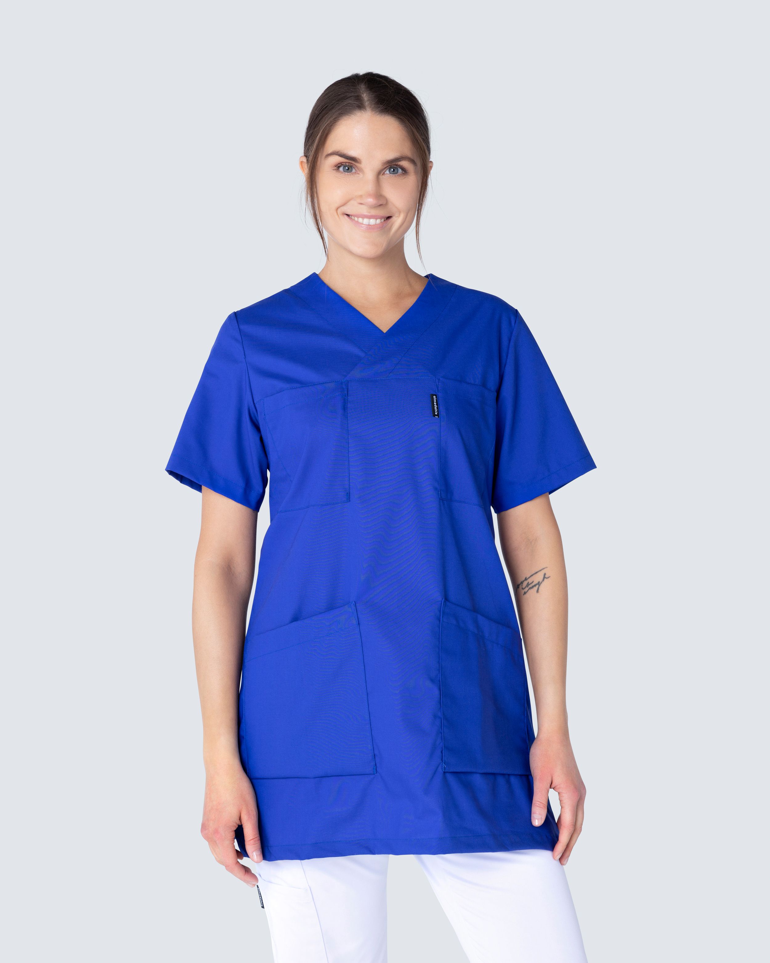 Feminin dametunika i en lett innsvingt modell og fin v-ringet hals. Tunikaen er tilvirket i en bomulls-/polyesterblanding hvilket gir den en sval og behagelig følelse. To brystlommer og to hoftelommer gir godt med plass for arbeidsutstyr. Hoftelommene har en ekstra mobillomme og nøkkelhank. Tunikaen har splitt på begge sidene for øket bevegelsesfrihet.