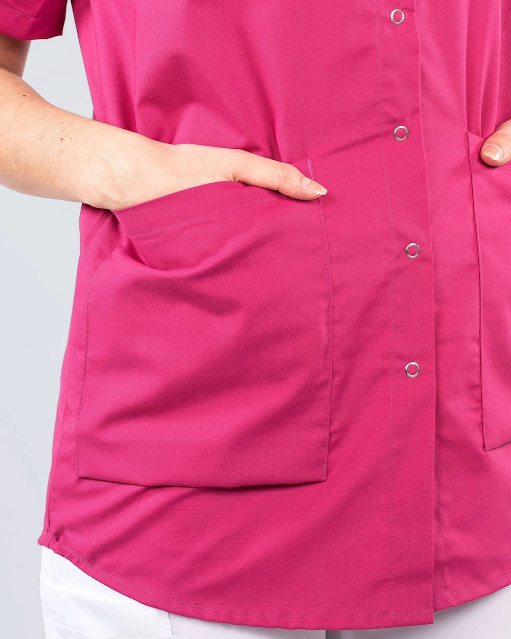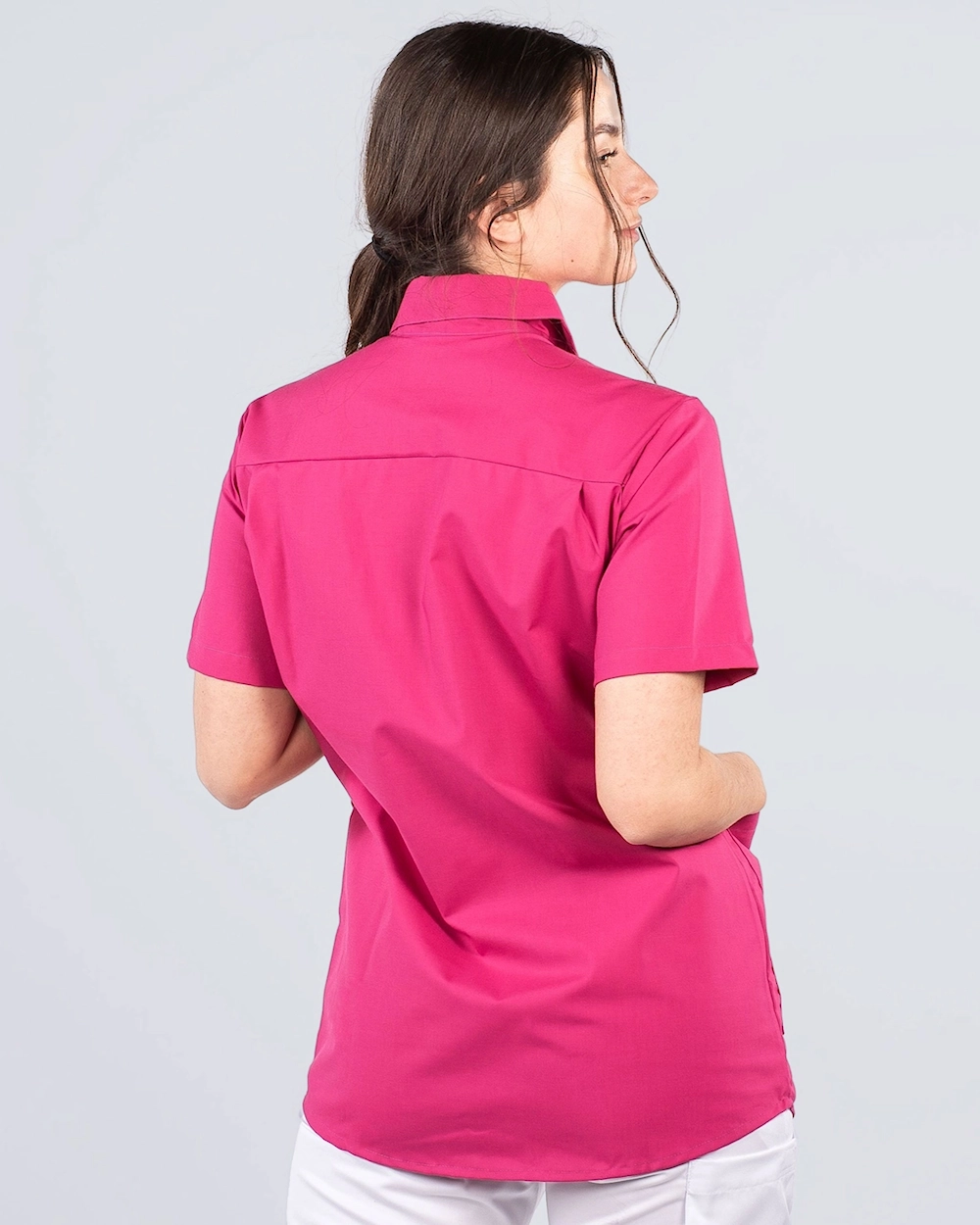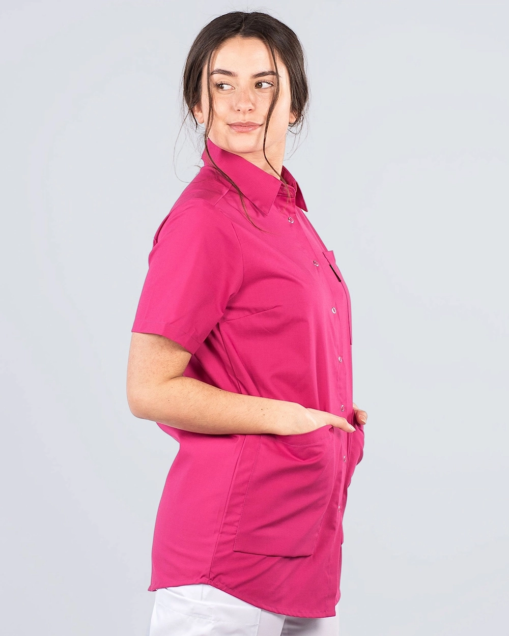 Behagelig og fin skjorte i damemodell. Skjorten er litt rundet i nederkant hvilket gir en fin silhuett. Ryggfold baktil gir ekstra bevegelsesfrihet og sammen med romslige lommer får du en behagelig og praktisk arbeidsskjorte. Skjorten har krage og hel knepping foran med trykkeknapper.