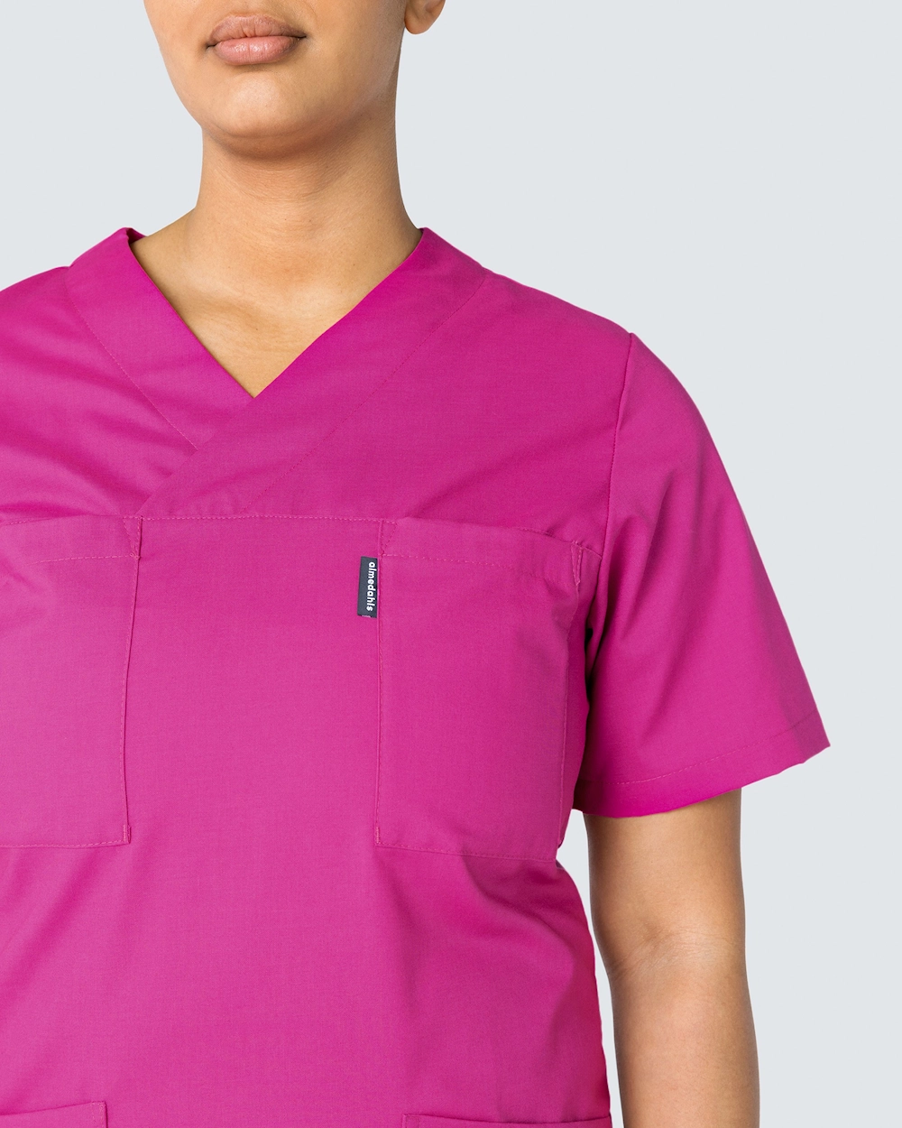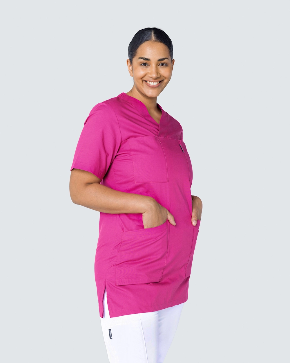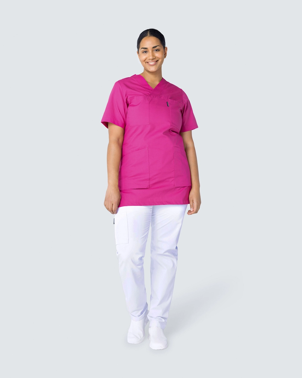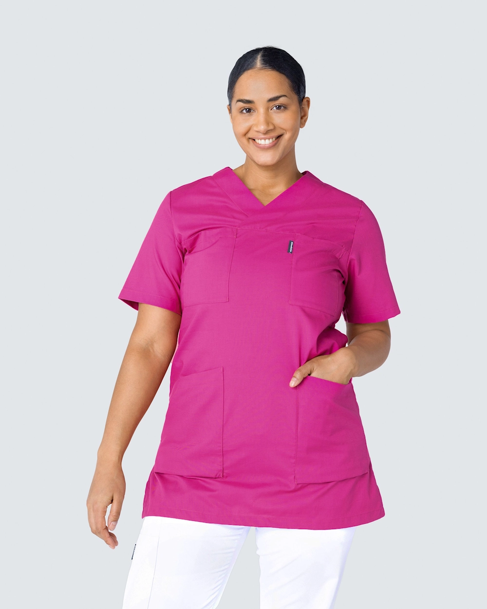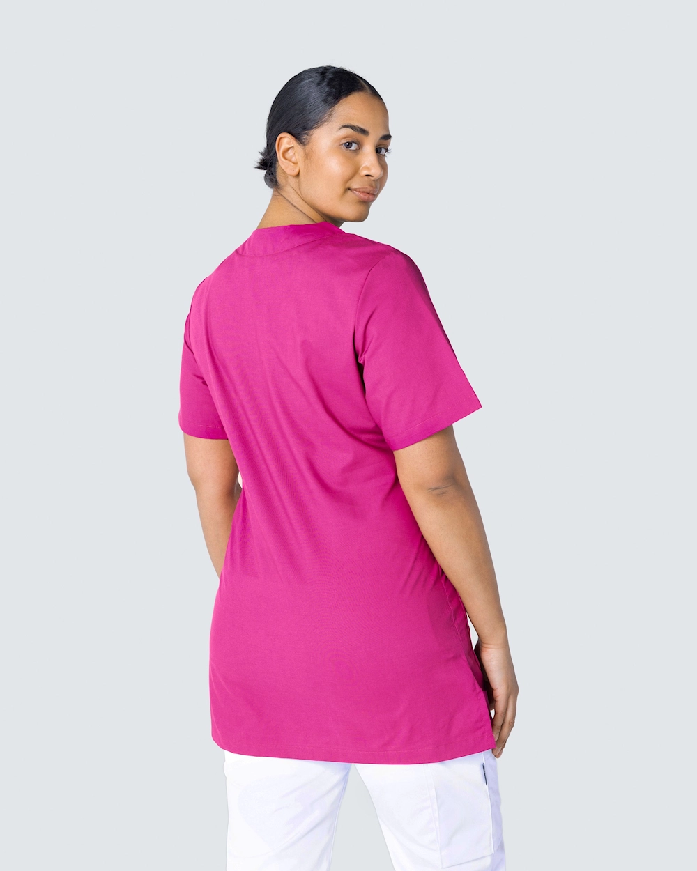 Feminin dametunika i en lett innsvingt modell og fin v-ringet hals. Tunikaen er tilvirket i en bomulls-/polyesterblanding hvilket gir den en sval og behagelig følelse. To brystlommer og to hoftelommer gir godt med plass for arbeidsutstyr. Hoftelommene har en ekstra mobillomme og nøkkelhank. Tunikaen har splitt på begge sidene for øket bevegelsesfrihet.
