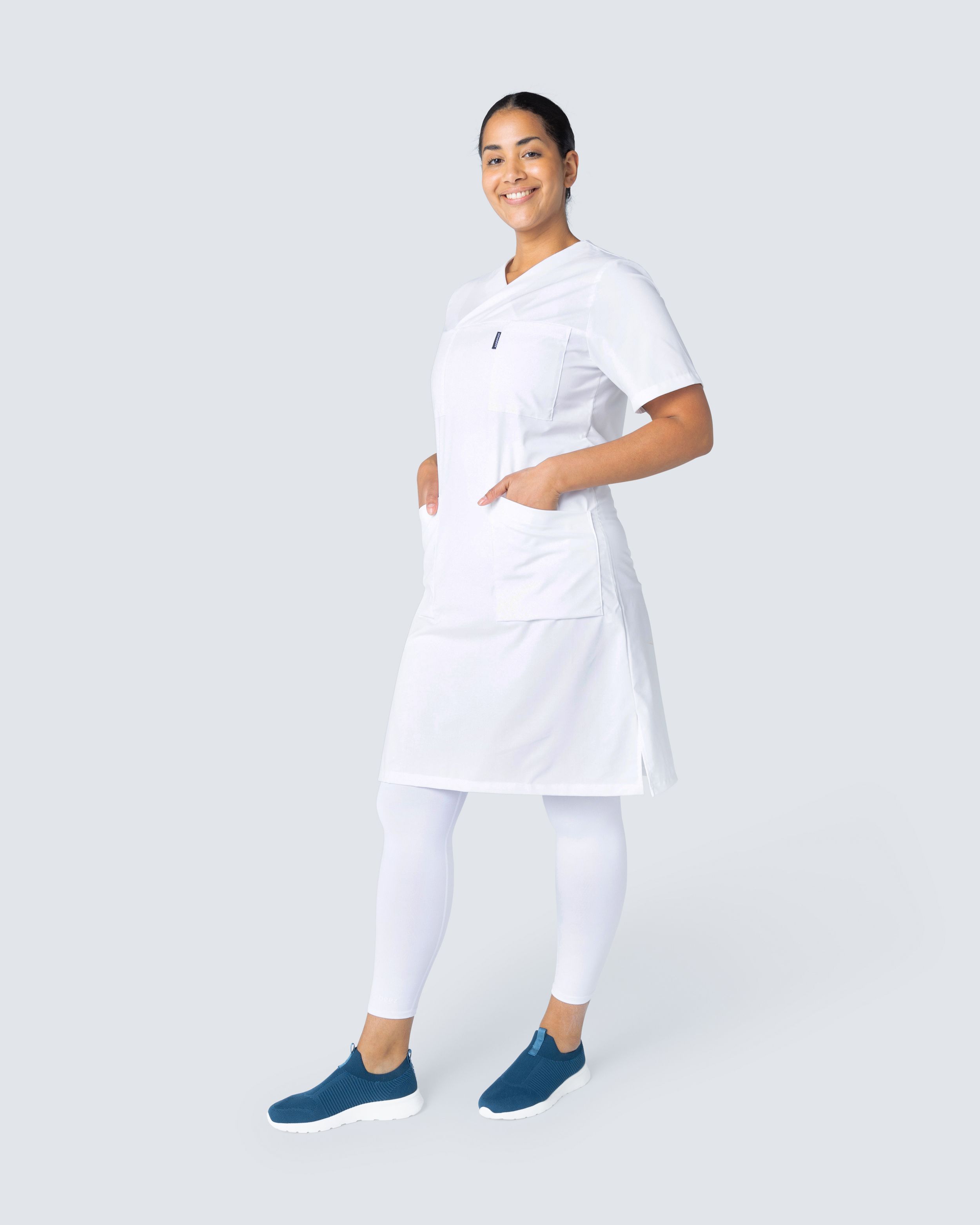 Behagelig arbeidskjole i bomulls-/polyesterblanding. Kjolen er lett a-linjeformet hvilket gir en fin silhuett. Kjolen har godt om plass for arbeidsutstyr med to brystlommer og to hoftelommer. Sidelommene har en ekstra mobillomme og nøkkelhank. Kjolen har splitt på begge sidene for øket bevegelsesfrihet.