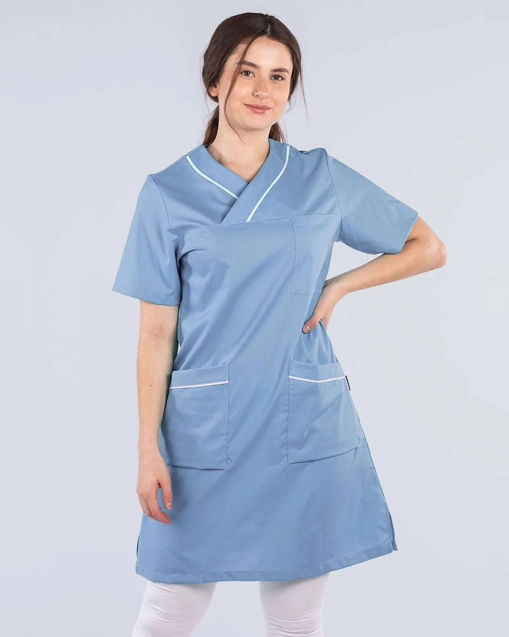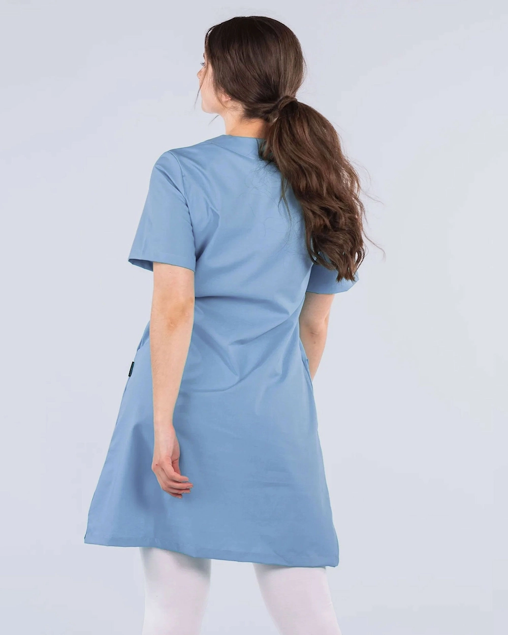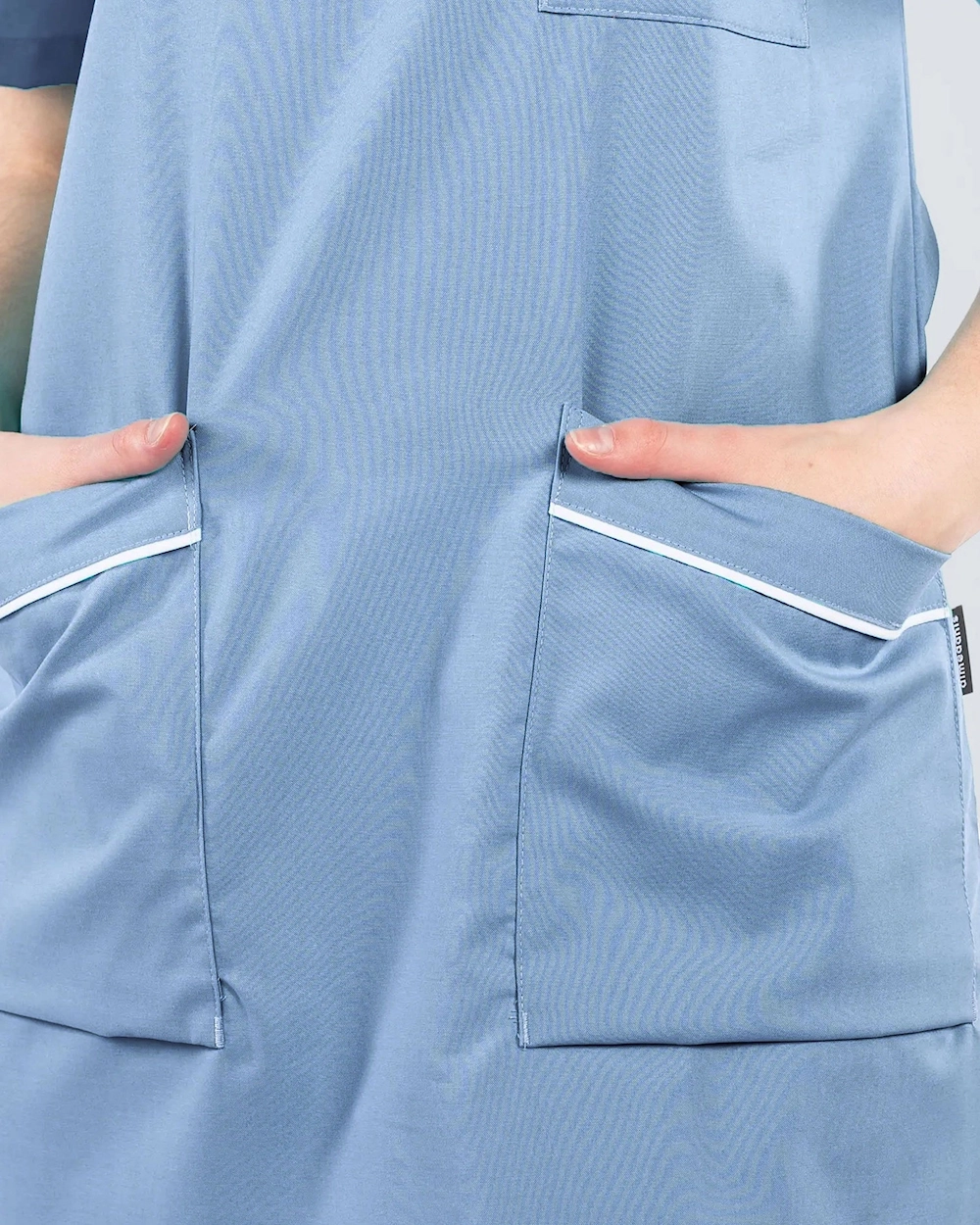 Arbeidskjole med fine detaljer med passepoil ved hals og lommer. Kjolen har brystlomme og to romslige hoftelommer. Med en spalte i sidene får du et behagelig plagg med god bevegelsesvidde.