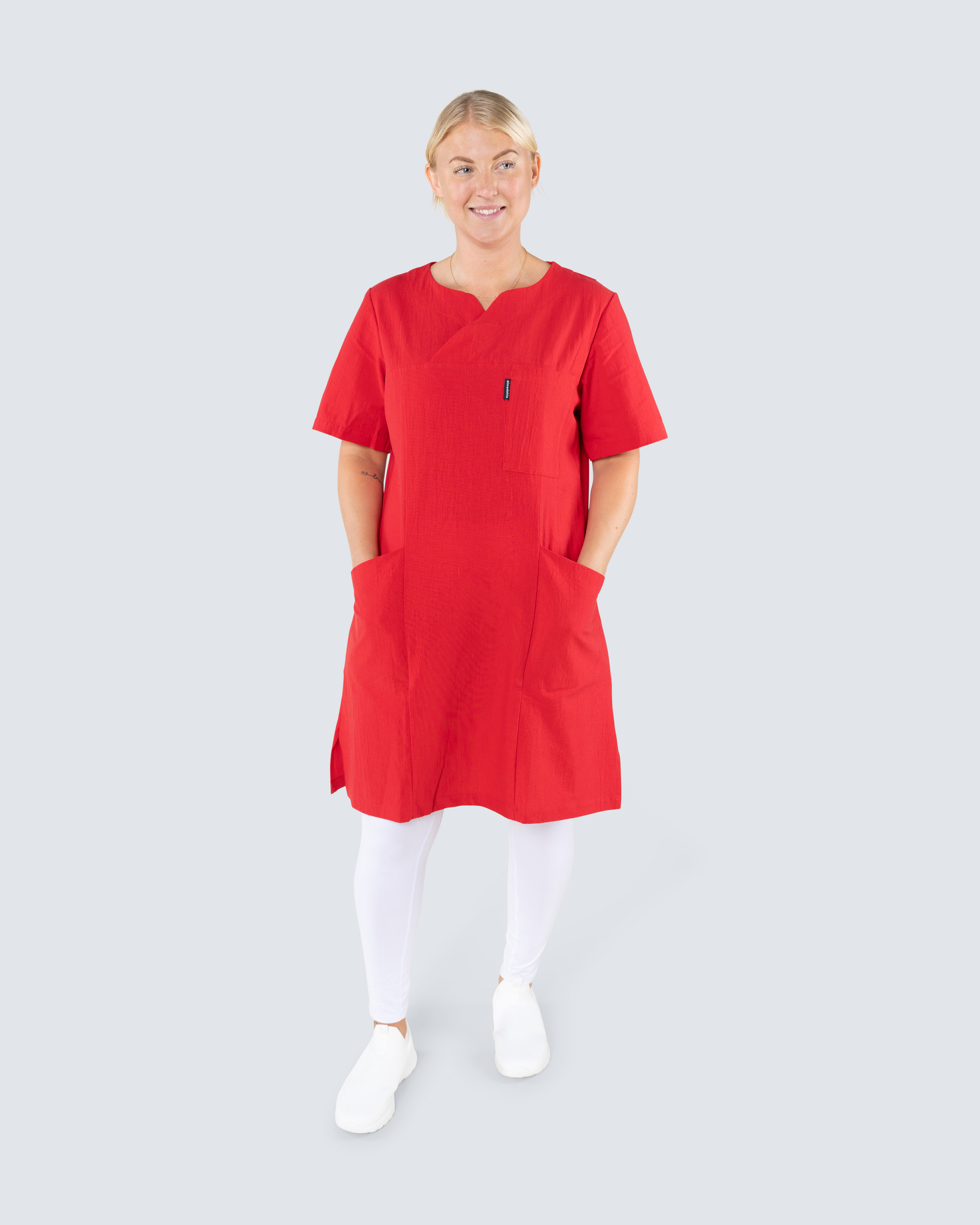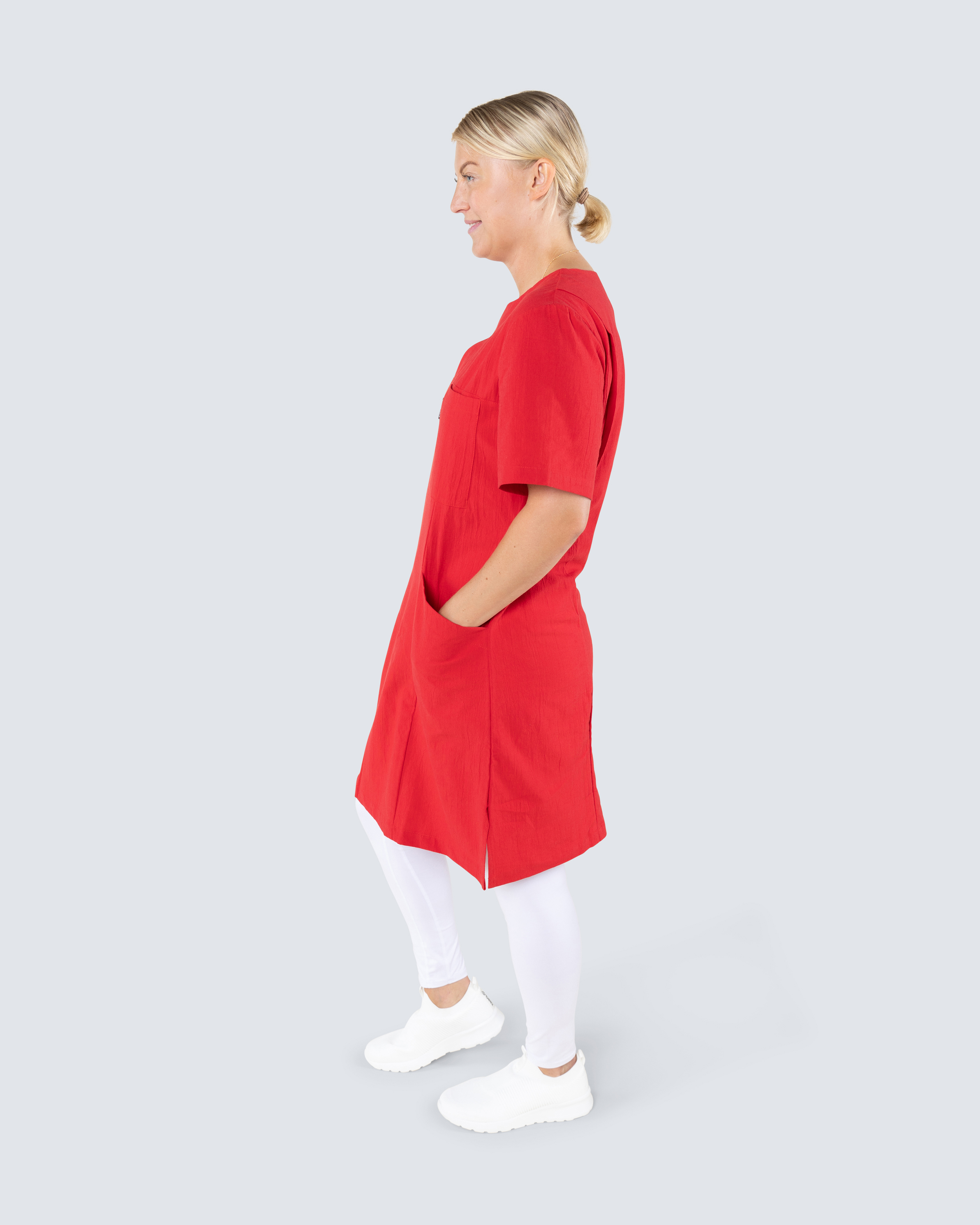 Behagelig arbeidskjole i knelang modell. Kjolen har ringet v-hals og er lett figursydd for en fin passform. Med både brystlomme og to hoftelommer får du godt med plass for arbeidsutstyr. Kjolen er tilvirket i kriklet bomull hvilket gir den en sval og behagelig følelse samtidig som stoffet minsker behovet av stryking.