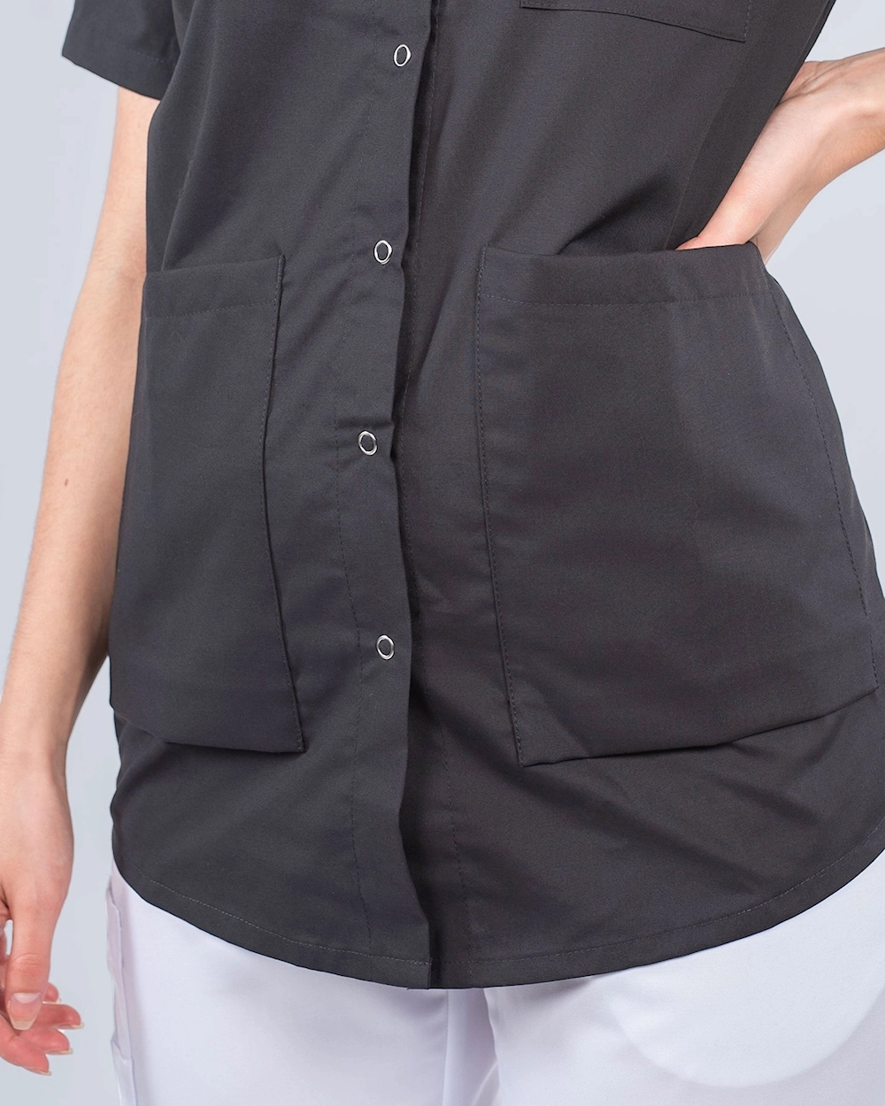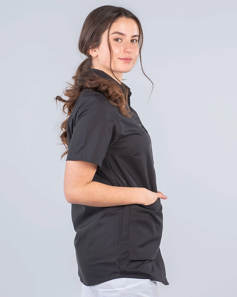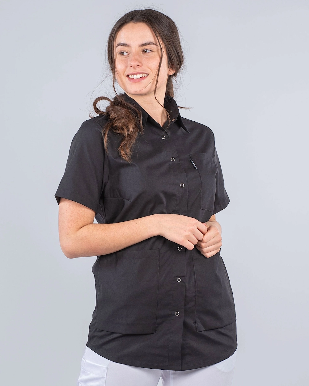 Behagelig og fin skjorte i damemodell. Skjorten er litt rundet i nederkant hvilket gir en fin silhuett. Ryggfold baktil gir ekstra bevegelsesfrihet og sammen med romslige lommer får du en behagelig og praktisk arbeidsskjorte. Skjorten har krage og hel knepping foran med trykkeknapper.