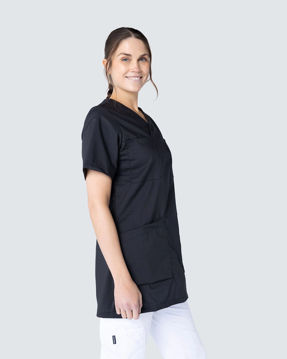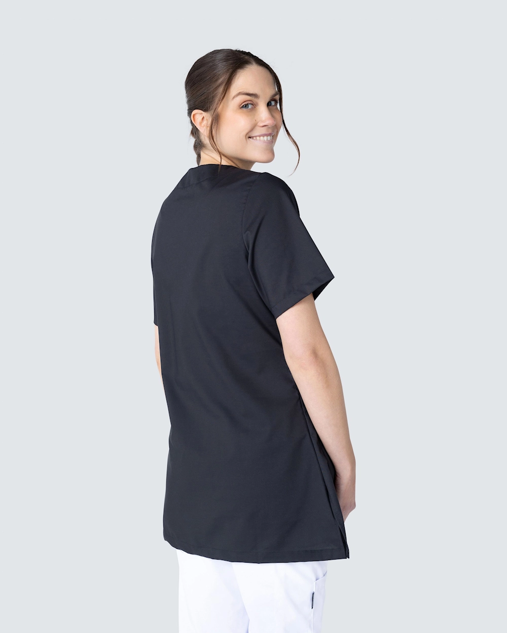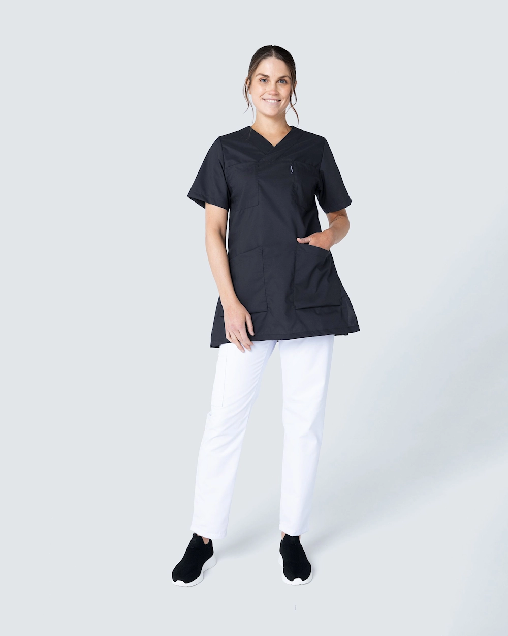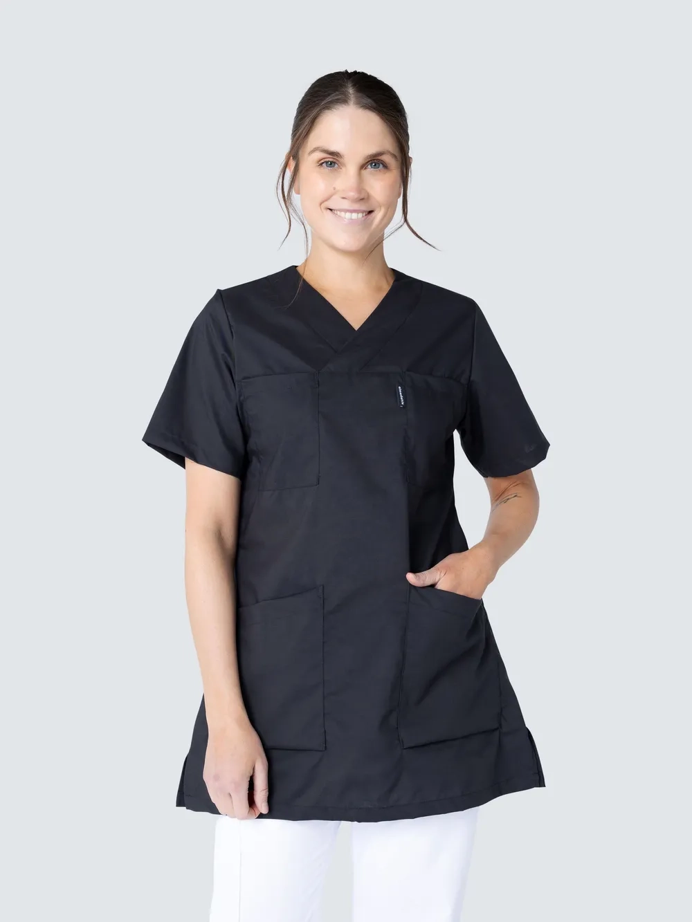 Feminin dametunika i en lett innsvingt modell og fin v-ringet hals. Tunikaen er tilvirket i en bomulls-/polyesterblanding hvilket gir den en sval og behagelig følelse. To brystlommer og to hoftelommer gir godt med plass for arbeidsutstyr. Hoftelommene har en ekstra mobillomme og nøkkelhank. Tunikaen har splitt på begge sidene for øket bevegelsesfrihet.