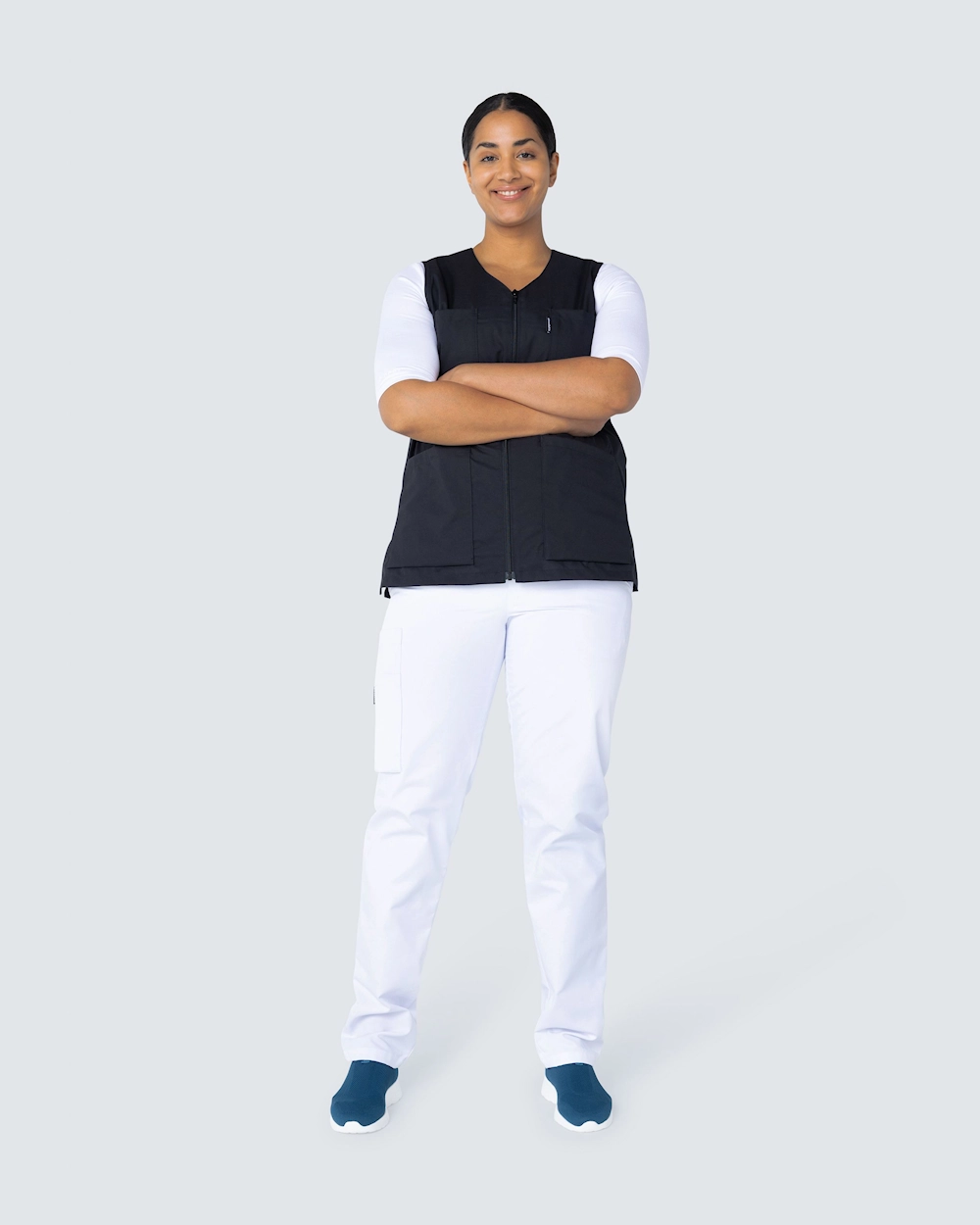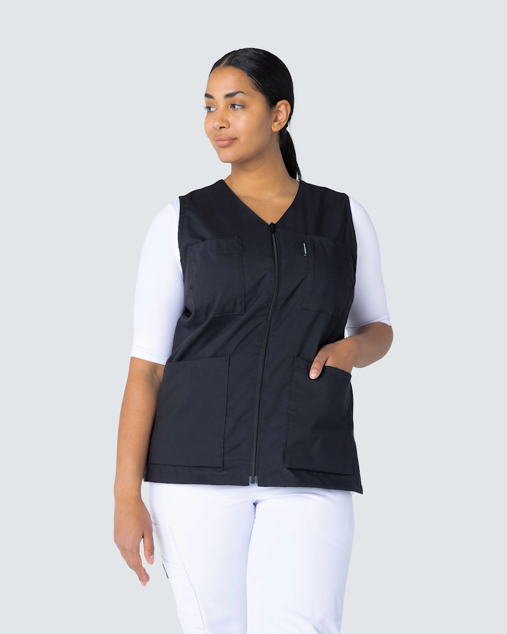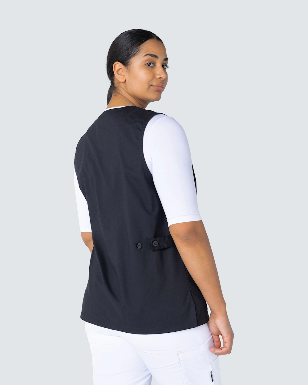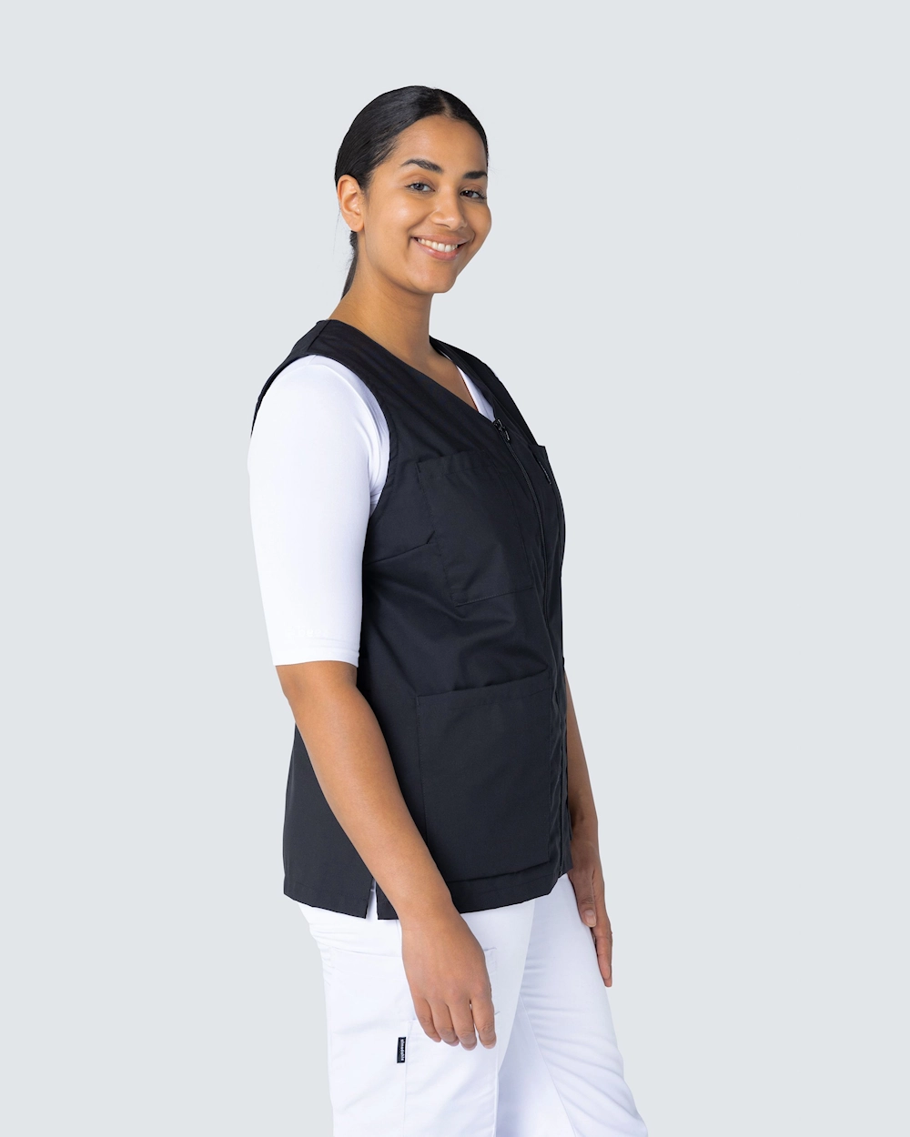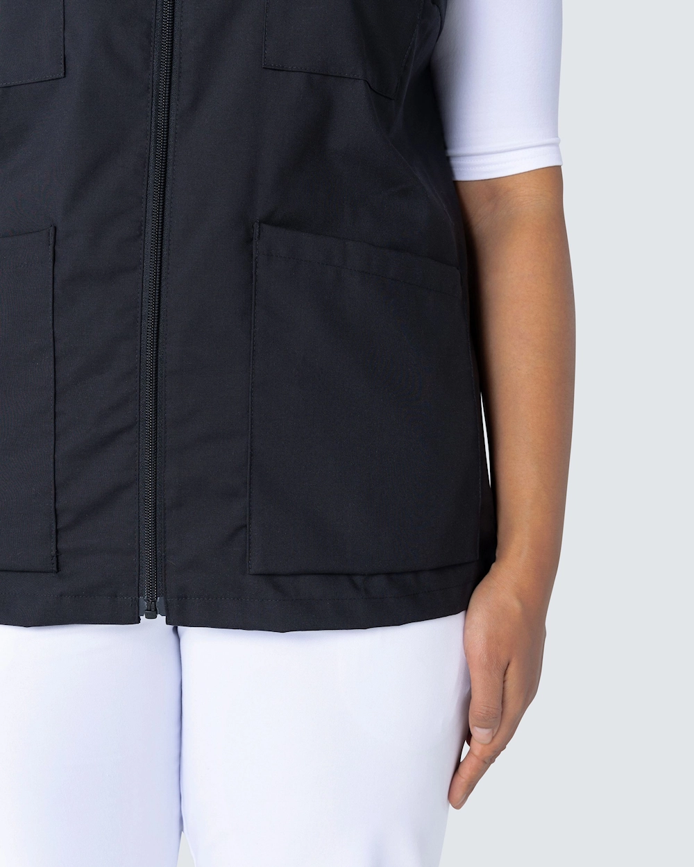Denne arbeidsvesten har v-hals og er lett skreddersydd for en fin passform. Med to brystlommer og to sidelommer har du god plass til penner, noteringsblokk og arbeidsutstyr du trenger å ta med deg. Vesten har en justerbar midje med en knappesløyfe bak slik at du kan justere passformen. Med en spalte i sidene får du rikelig med bevegelsesområde og et komfortabelt arbeidsplagg.