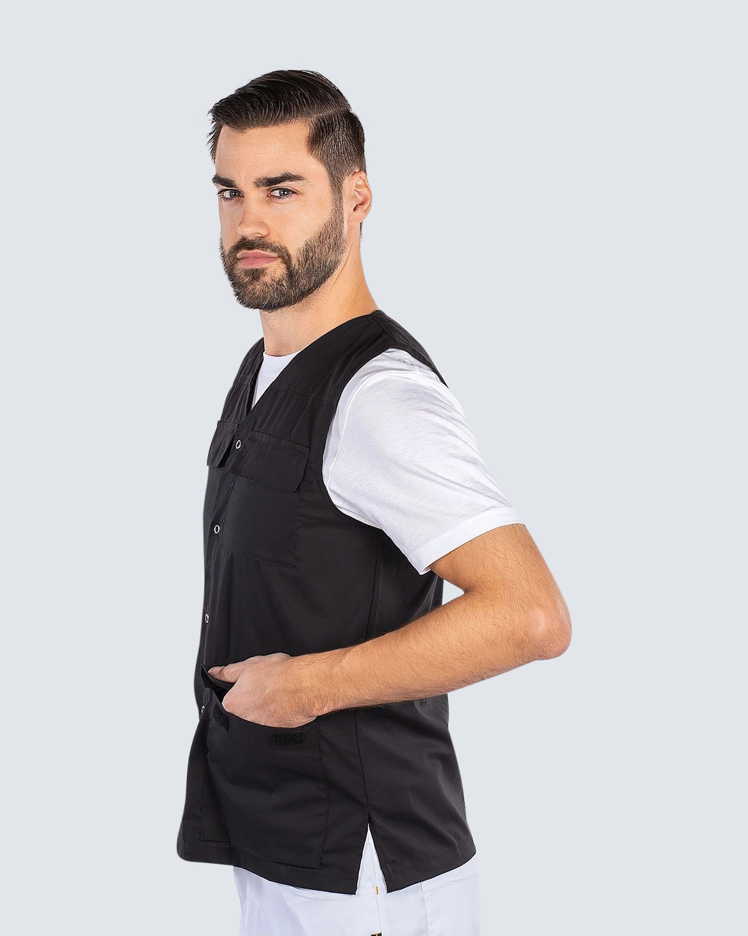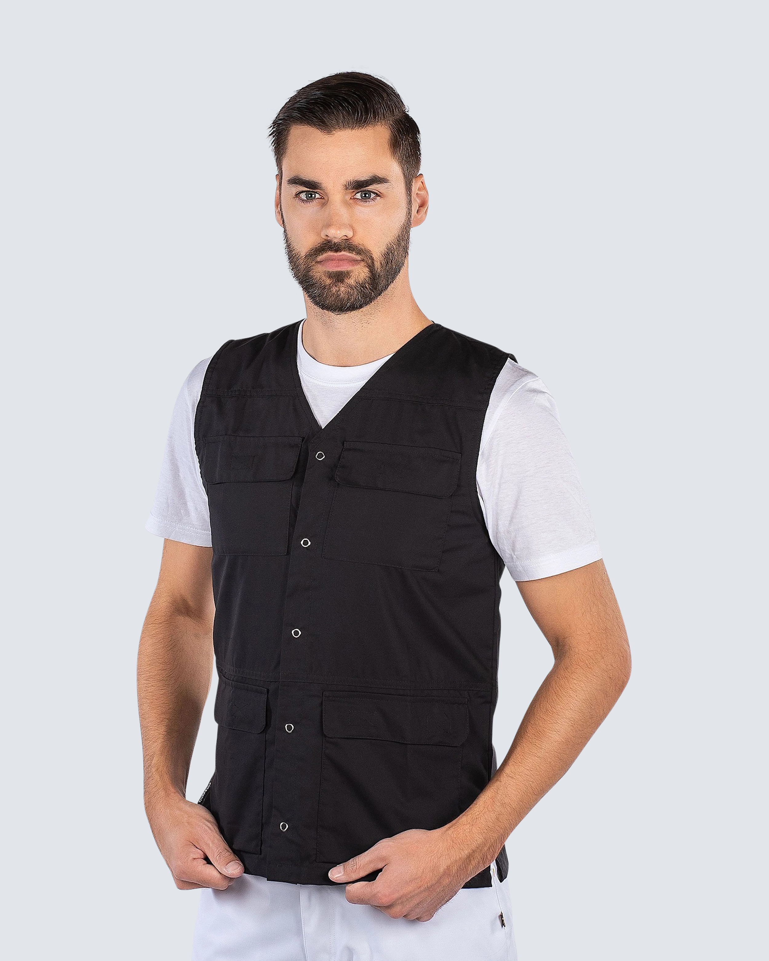 Arbeidsvest i rett modell med v-hals og trykknapper foran. Vesten gir god plass til arbeidsutstyr med to brystlommer og to hoftelommer.