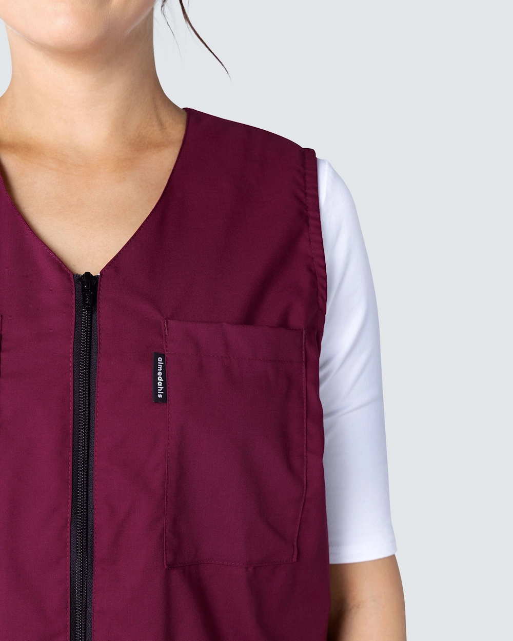 Denne arbeidsvesten har v-hals og er lett skreddersydd for en fin passform. Med to brystlommer og to sidelommer har du god plass til penner, noteringsblokk og arbeidsutstyr du trenger å ta med deg. Vesten har en justerbar midje med en knappesløyfe bak slik at du kan justere passformen. Med en spalte i sidene får du rikelig med bevegelsesområde og et komfortabelt arbeidsplagg.