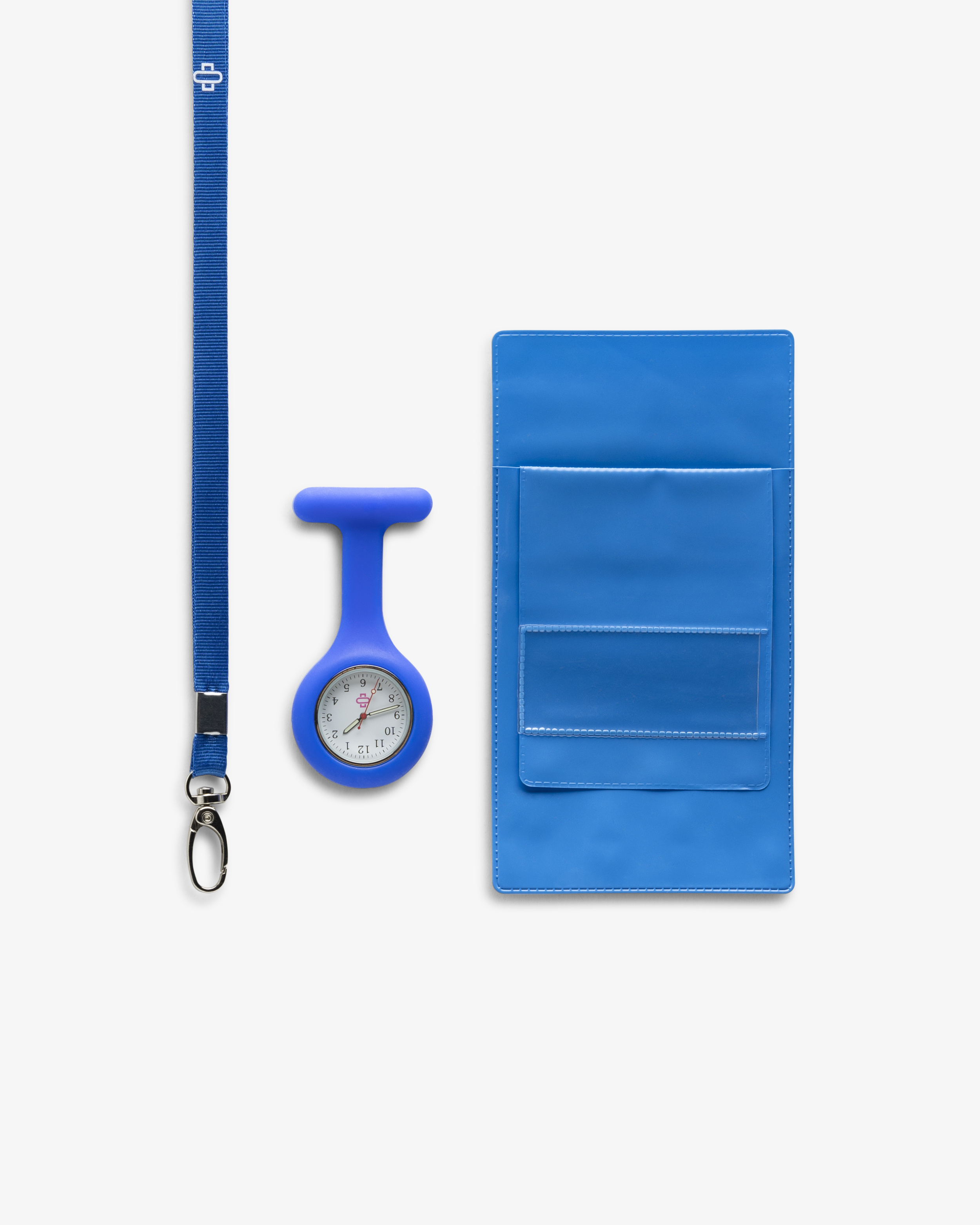 Et praktisk og stilrent sett med arbeidstilbehør i blått. Du får en matchende silikonsykepleierklokke, nøkkelbånd og penneholder – alt i en flott blåfarge som både er funksjonell og personlig.