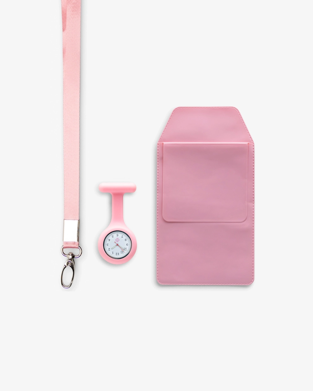 Et praktisk og fint kit med rosa detaljer – perfekt for deg som vil ha kontroll på viktige hjelpemidler i løpet av arbeidsdagen. Her får du en matchende silikonsykepleierklokke, nøkkelbånd og pennelomme. Enkelt og praktisk!