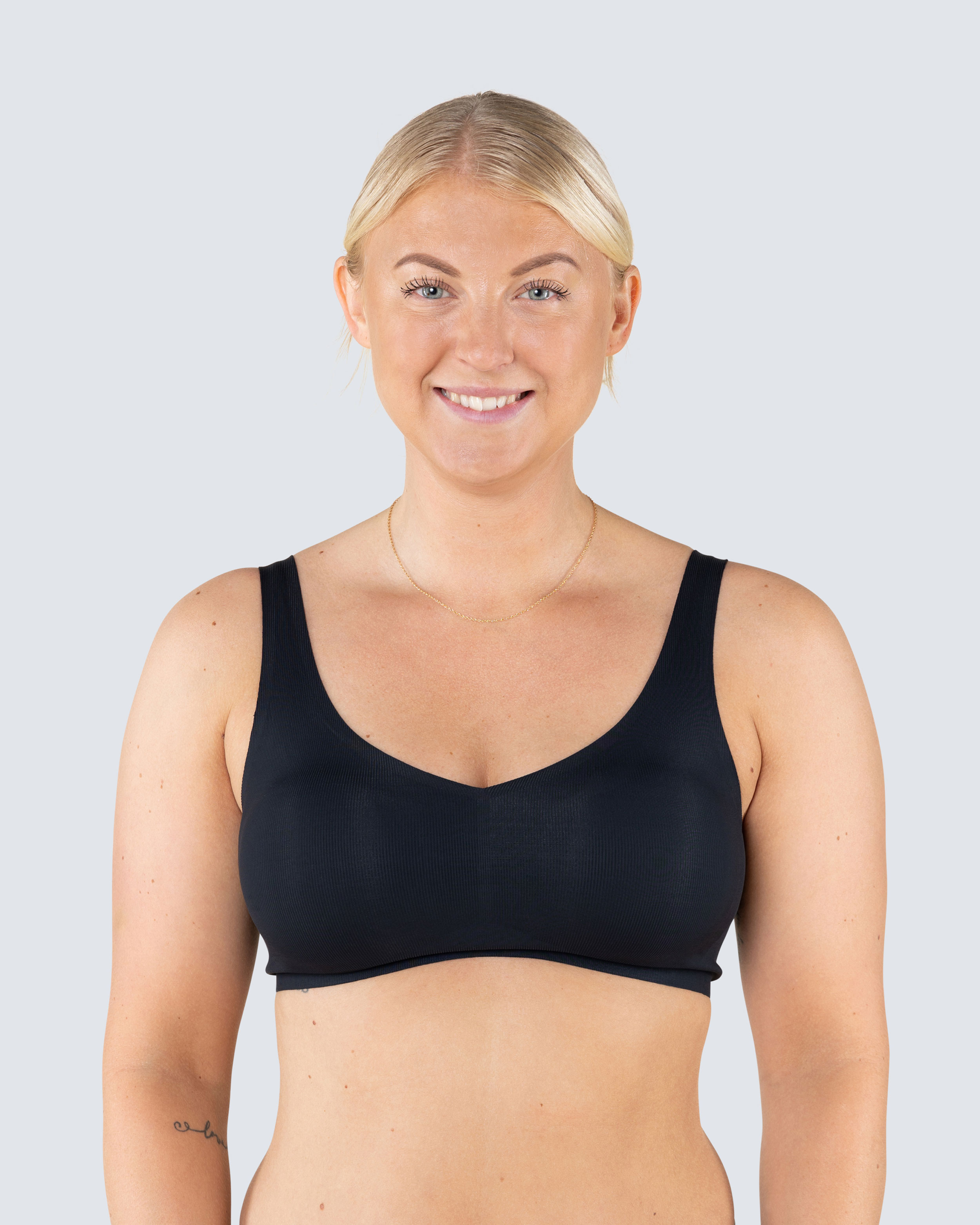 Topp i mykt og fleksibelt materiale som sitter behagelig mot kroppen. Toppen har en dekorativ V-hals og avtagbare innlegg for optimal komfort. Uten gnagende kanter eller sømmer som irriterer huden eller vises gjennom klærne.