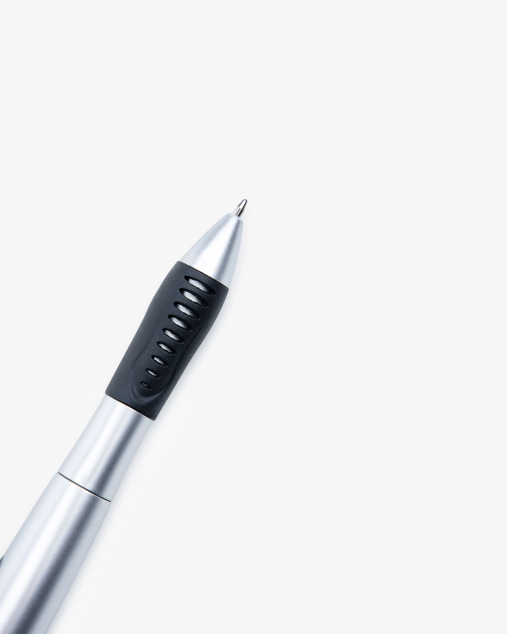 Praktisk 2-i-1 Penn. Ene enden har en kulespiss i svart blekk og andra overstrykningspenn i lyseblå farge.