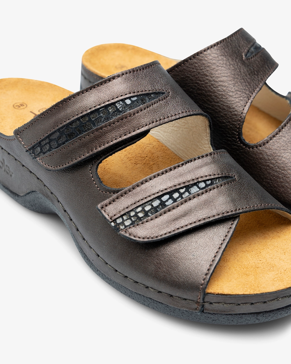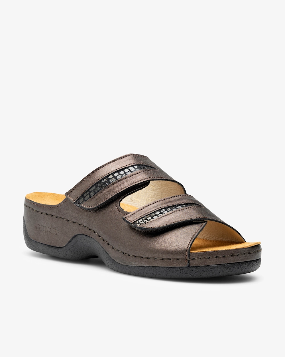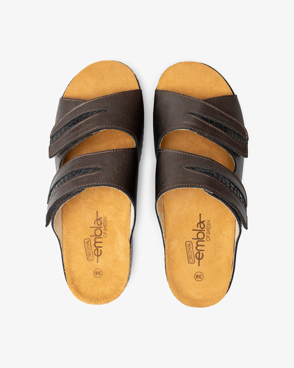 Damesandal i mykt skinn med utskiftbar, ergonomisk fotseng som gir støtte til fotbuen og løfter forfotbuen. Denne sandalen har justerbare remmer med borrelås og er skinnfôret. Yttersåle i gummiblanding som gir godt grep på underlaget, noe som gjør sandalen egnet for både innendørs og utendørs bruk.