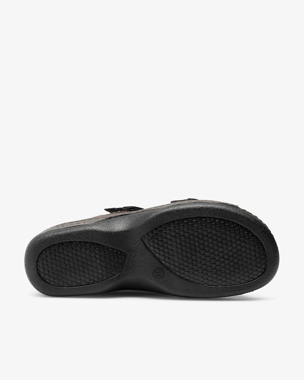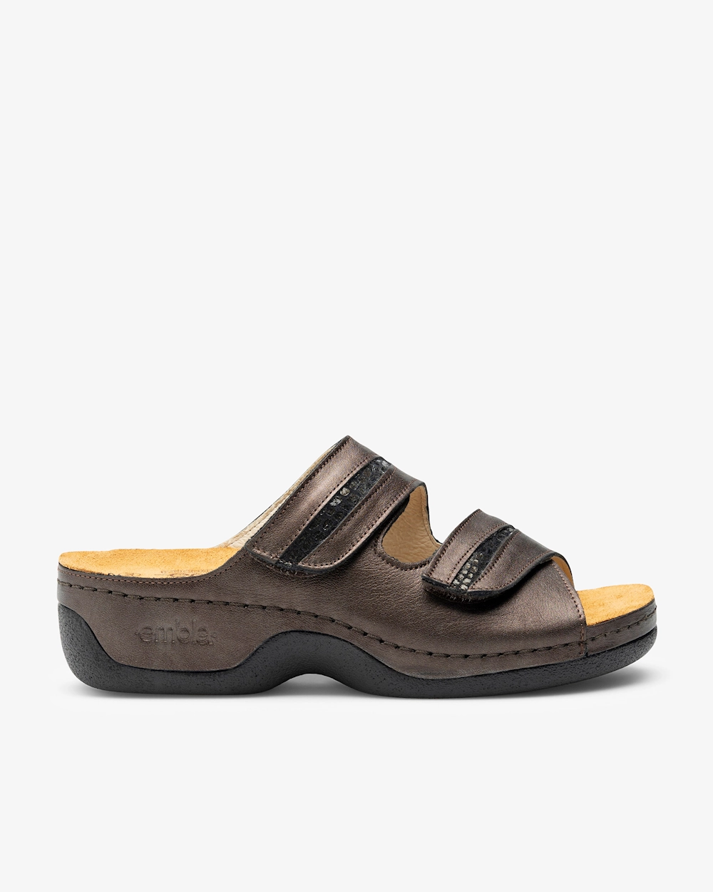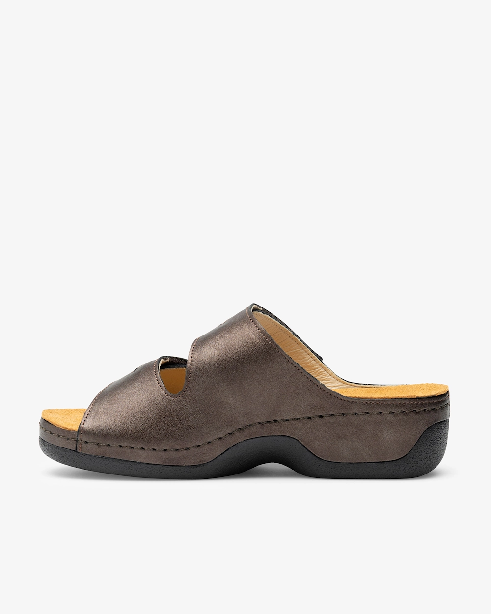 Damesandal i mykt skinn med utskiftbar, ergonomisk fotseng som gir støtte til fotbuen og løfter forfotbuen. Denne sandalen har justerbare remmer med borrelås og er skinnfôret. Yttersåle i gummiblanding som gir godt grep på underlaget, noe som gjør sandalen egnet for både innendørs og utendørs bruk.