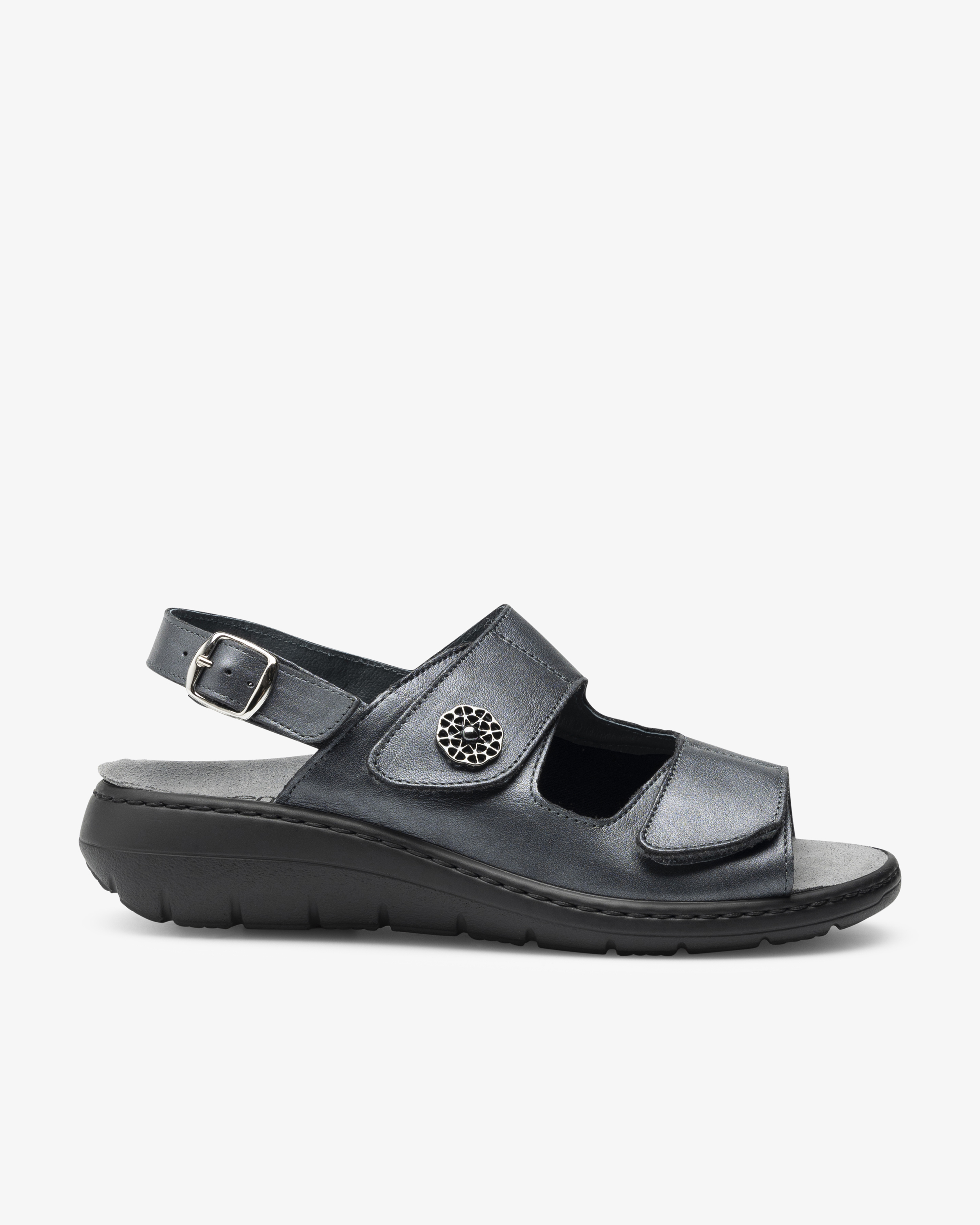 Fottilpasset skinnsandal i damemodell med utskiftbar, ergonomisk fotseng som gir effektiv støtte. Sandalens innside har et elastisk parti som gir ekstra fleksibilitet og komfort for de som for eksempel har Hallux Valgus. To justerbare remmer med borrelås og justerbar hælrem med spenne.