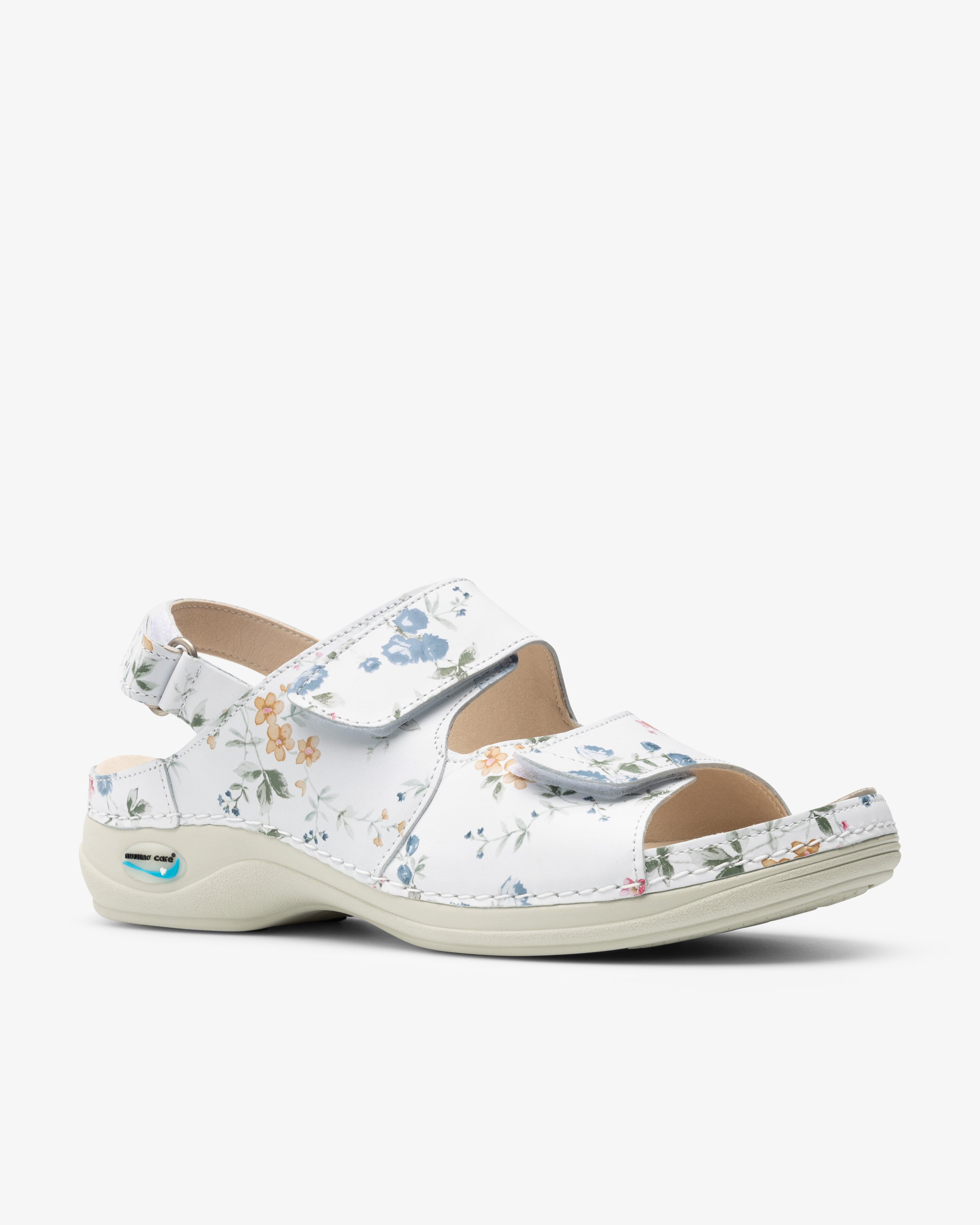 Skinnsandal i damemodell med utskiftbar, ergonomisk oppbygd fotseng. Sandalen kan vaskes i maskin på opptil 30 ⁰C for å opprettholde god hygiene i helsemiljøer. Sklisikker yttersåle med godt grep mot underlaget og antistatiske egenskaper som beskytter mot statisk elektrisitet. Tre justerbare remmer med borrelås, to øverst og én bak, for optimal passform.
