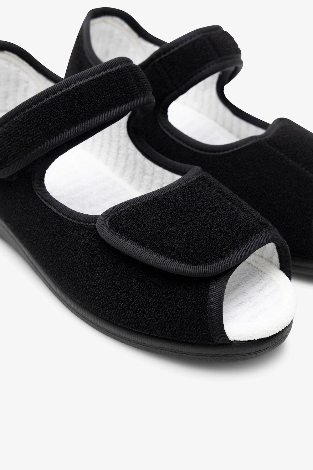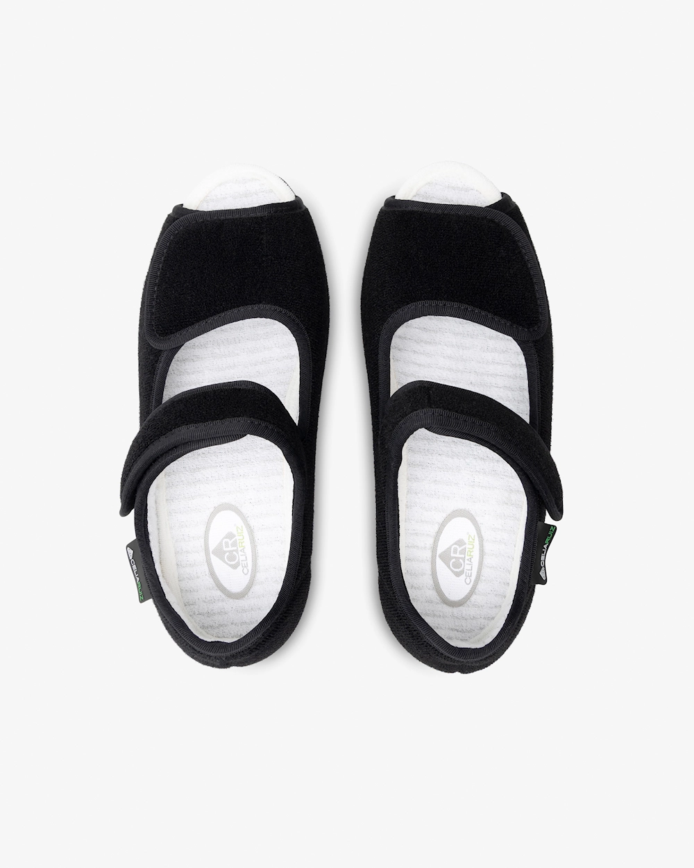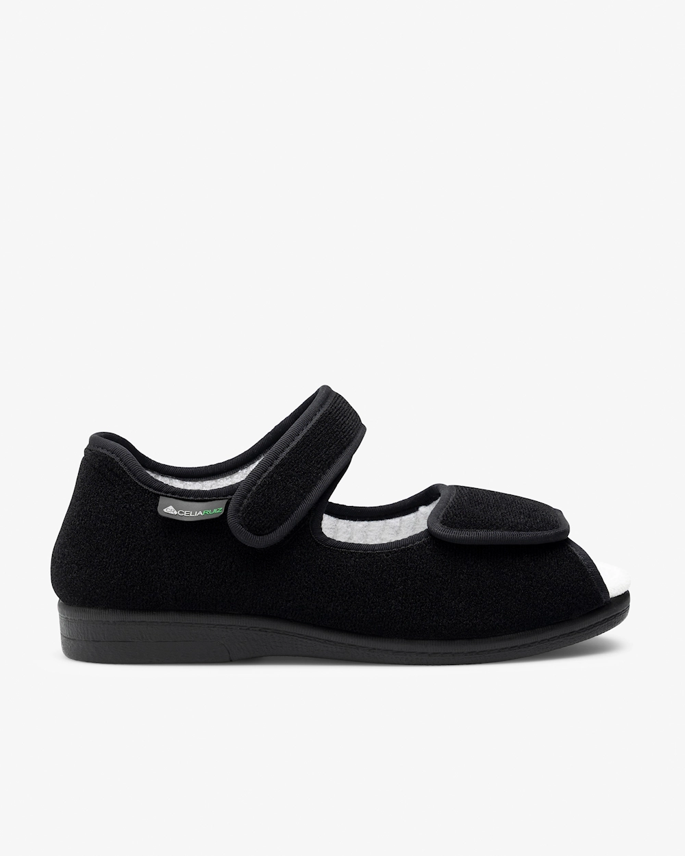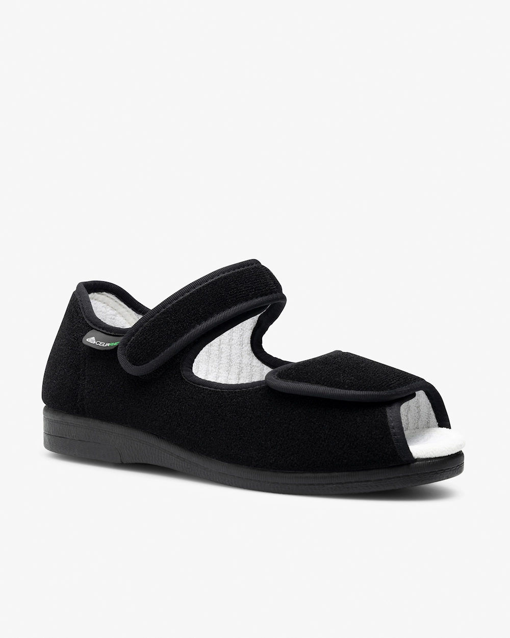 Ortopedisk spesialsko med romslig lest og åpen tå, designet for personer med bred forfot. Skoen har to justerbare remmer med borrelås og er enkel å ta av og på. Sklisikker og stabil yttersåle som gir godt grep mot underlaget. Kan vaskes på maks 30 ⁰C, gjerne i vaskepose, og skal lufttørkes. Denne skoen er perfekt for deg med sensitive føtter.