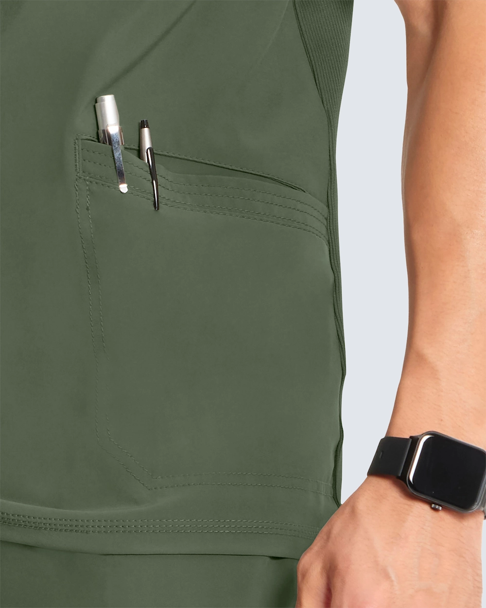 Modellen med V-hals er funksjonell med tre praktiske lommer for oppbevaring av redskaper og eiendeler.