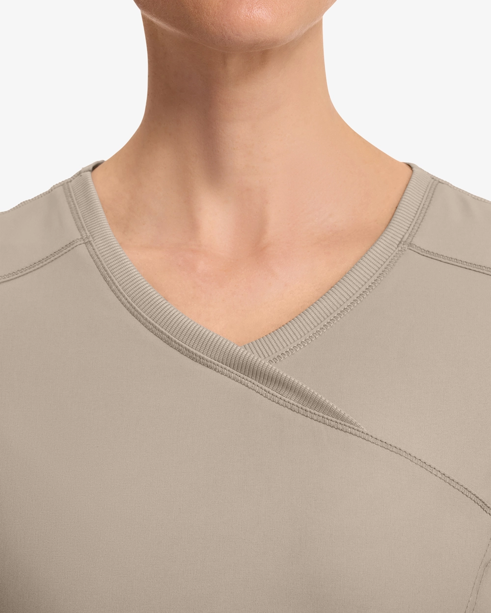 Den moderne tunikaen med omslag for kvinner kombinerer stil og funksjonalitet for profesjonelle helsearbeidere.