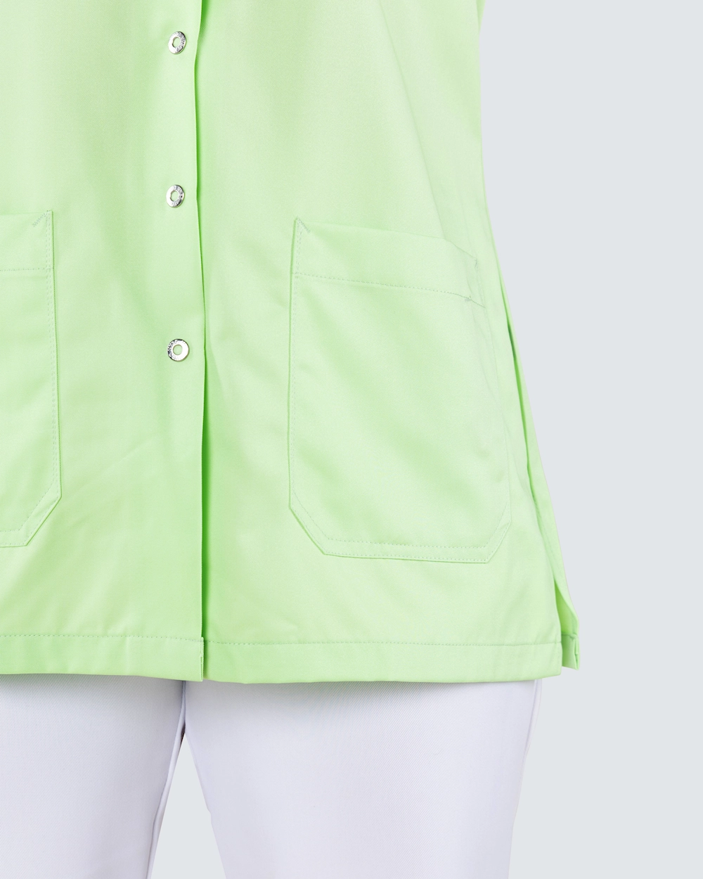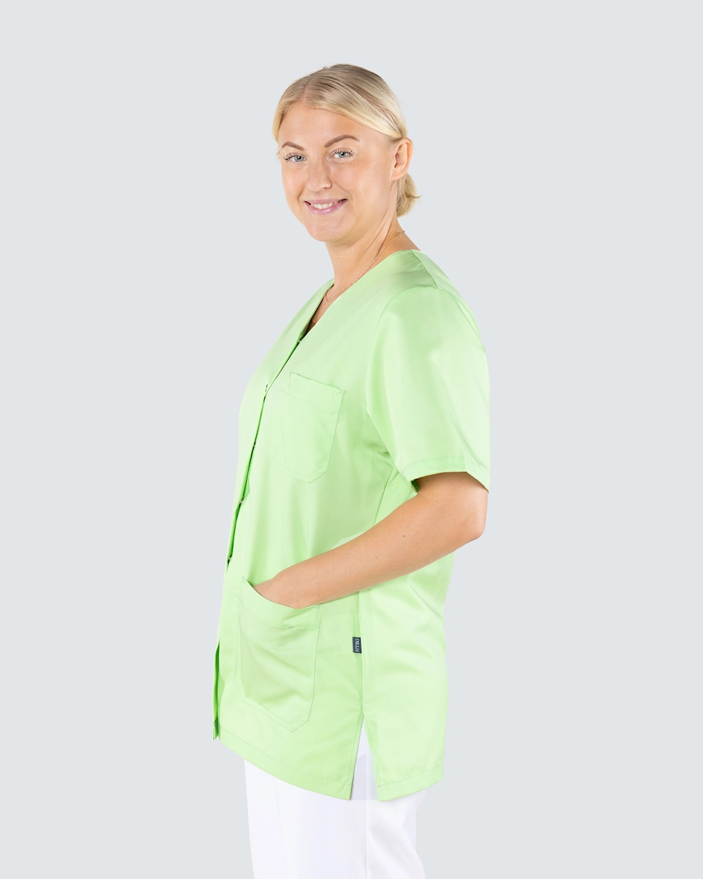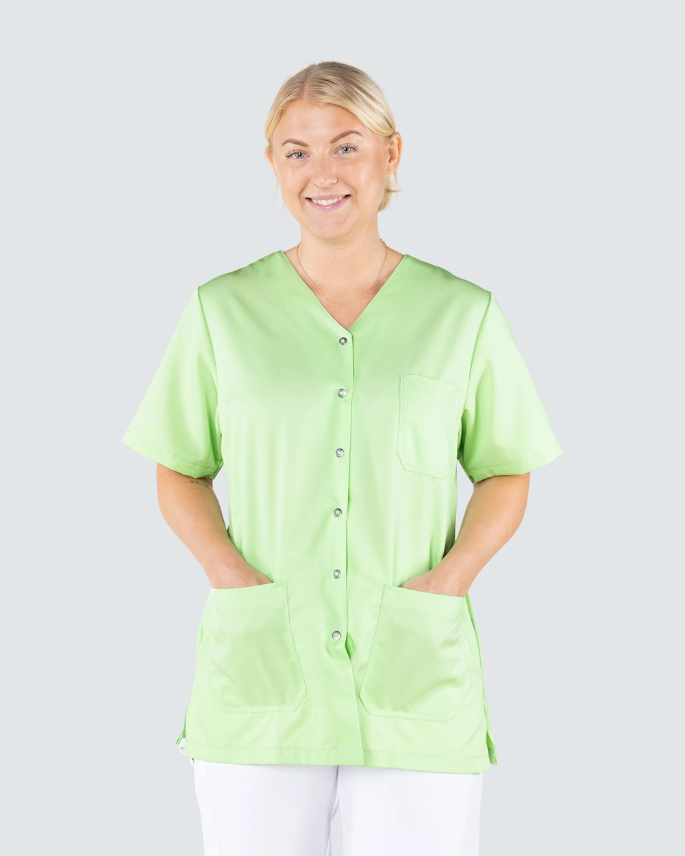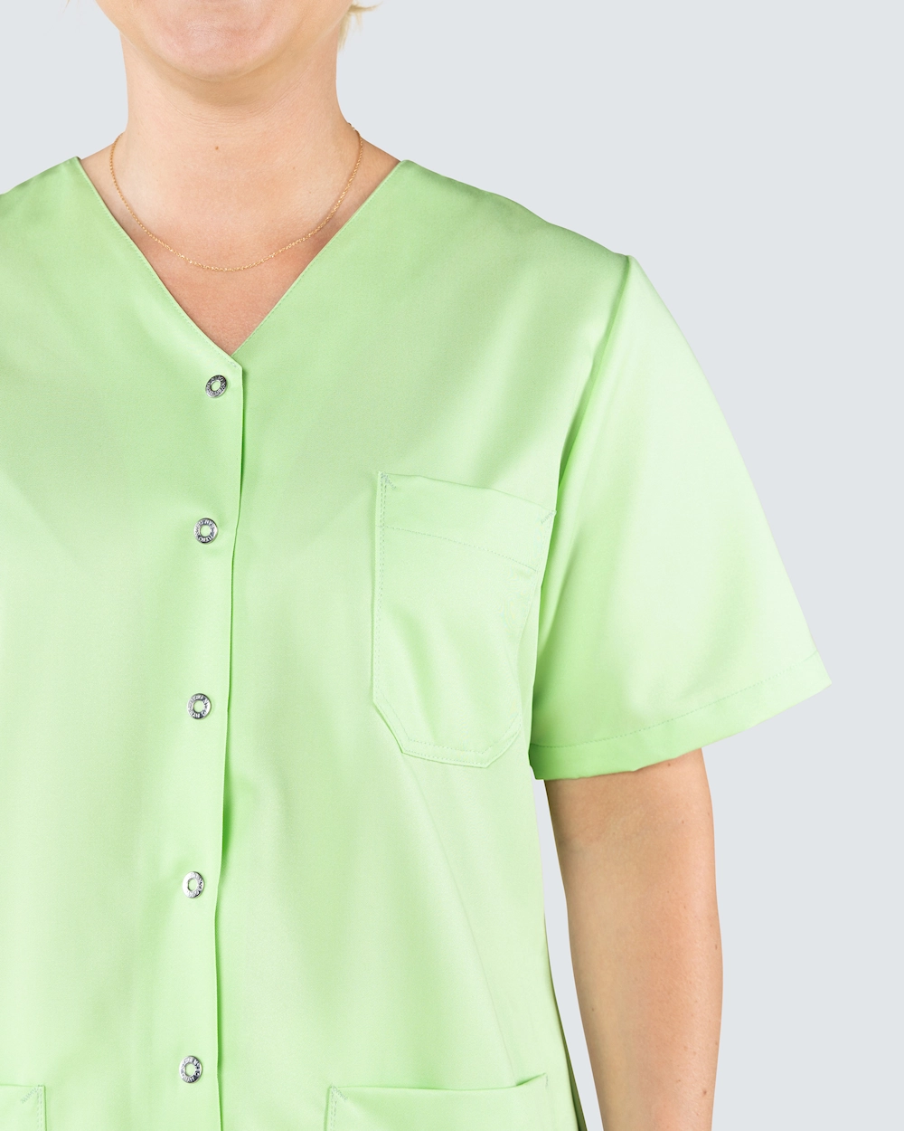 Helsetunika i damemodell med lett skreddersydd form for en fin passform. Praktisk knappslag med trykknapper - perfekt for deg med et pleieyrke der det er mye smuss og søl og du ikke vil trekke tunikaen over hodet. Tunikaen er laget av miljøvennlig Tencel som gir god komfort og god pusteevne.