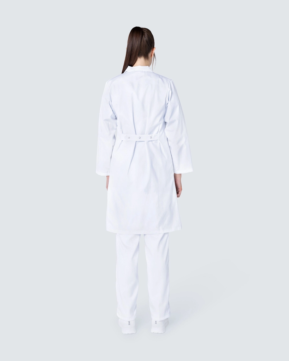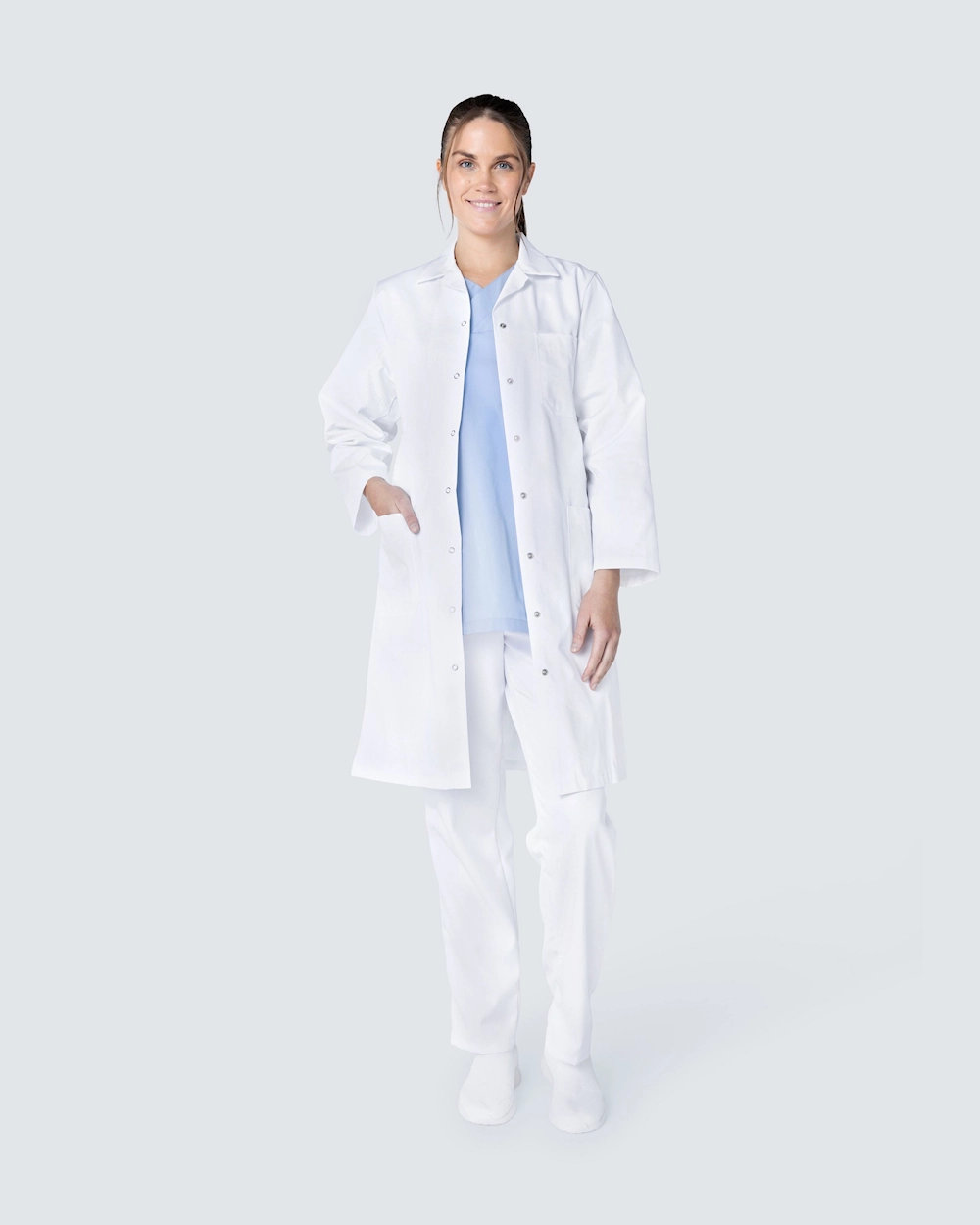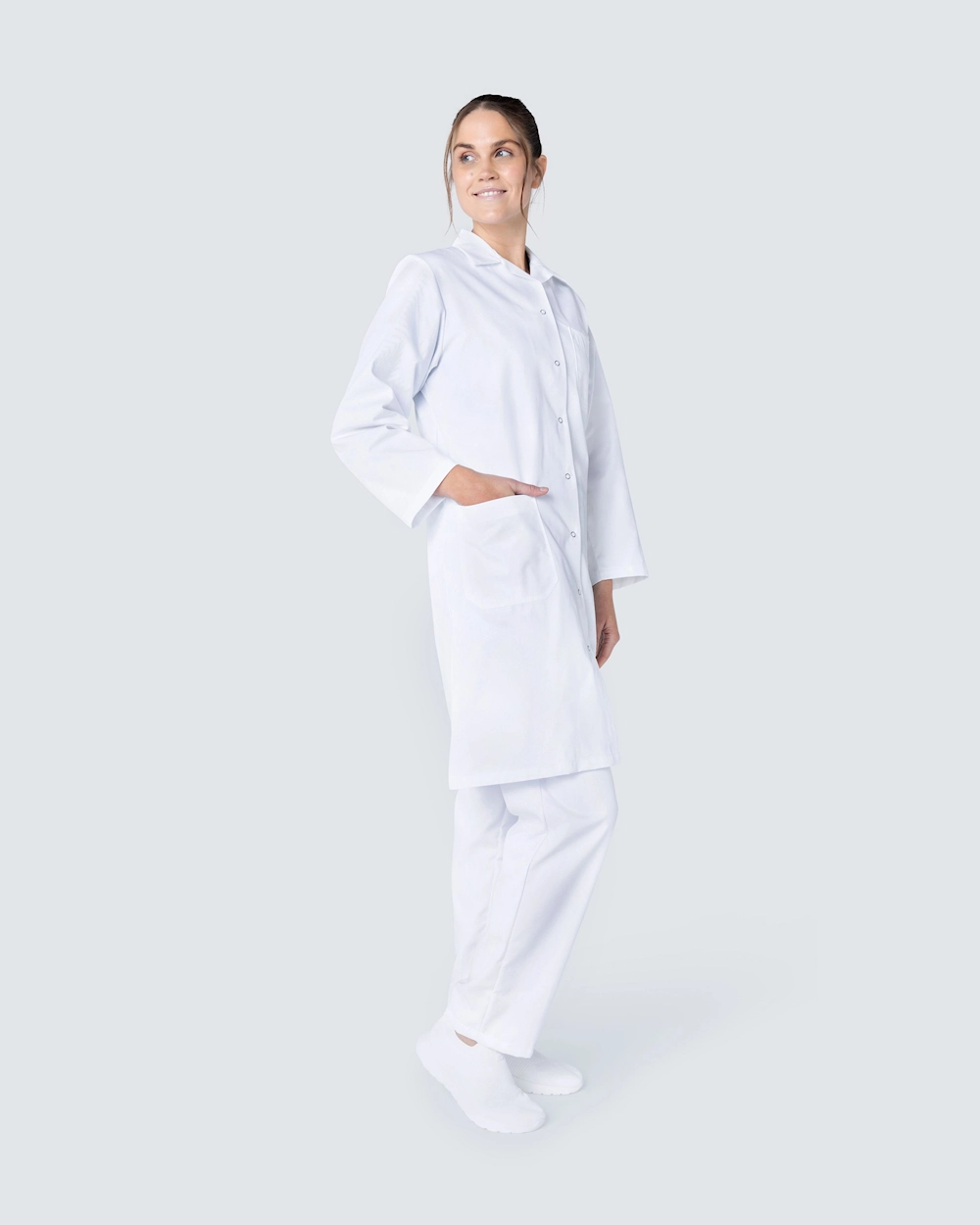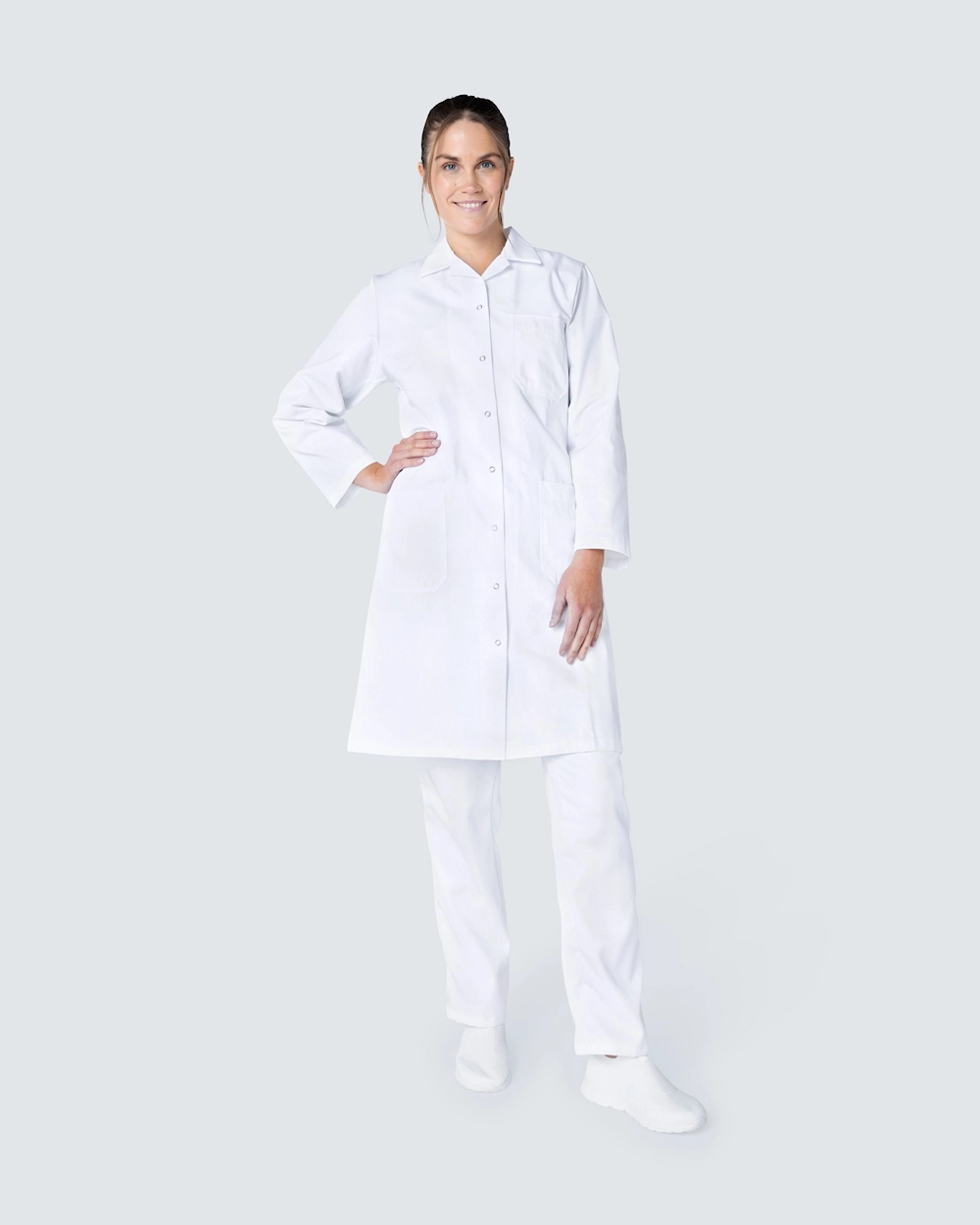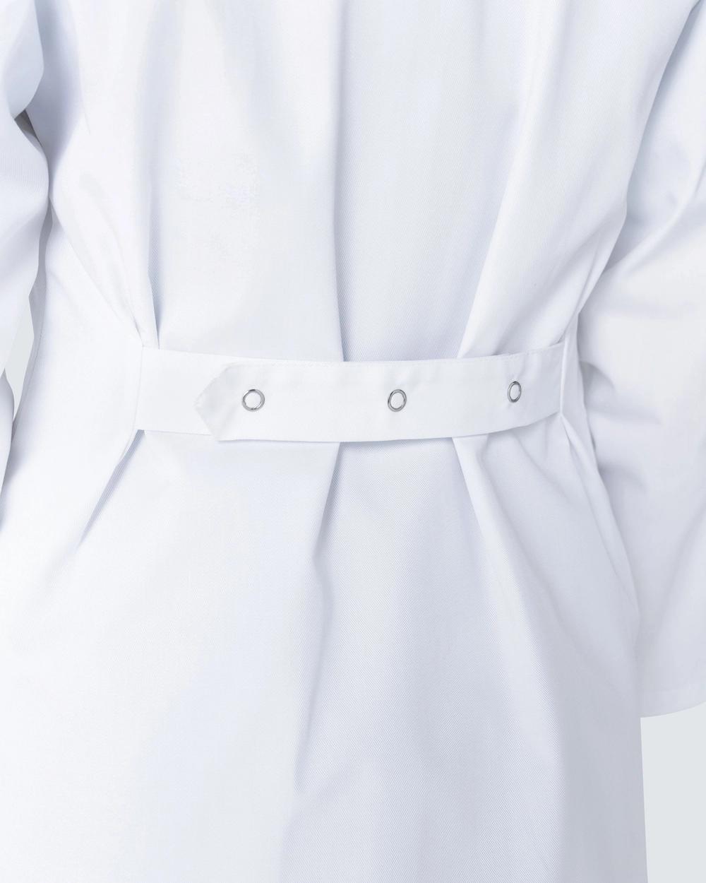 Denne legefrakken er sydd i en damemodell og er litt kortere i modellen. Med et elastisk knappebånd i ryggen kan du enkelt justere passformen. To romslige hoftelommer og en brystlomme med god plass til forskjellige arbeidsutstyr.