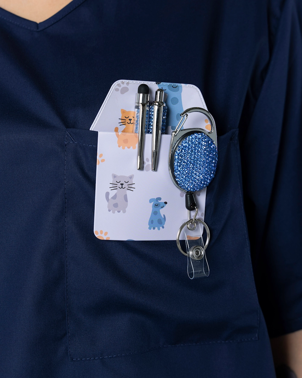 Slitesterk pennelomme som beskytter mot blekklekkasje, perfekt for pleiepersonalet. Dette slitesterke tilbehøret kombinerer stil og sikkerhet, og setter farge på arbeidsuniformen din. Med mange design og farger kan du uttrykke personligheten din uten å gå på kompromiss med funksjonaliteten. Perfekt for deg som ønsker praktiske og stilige helseprodukter.