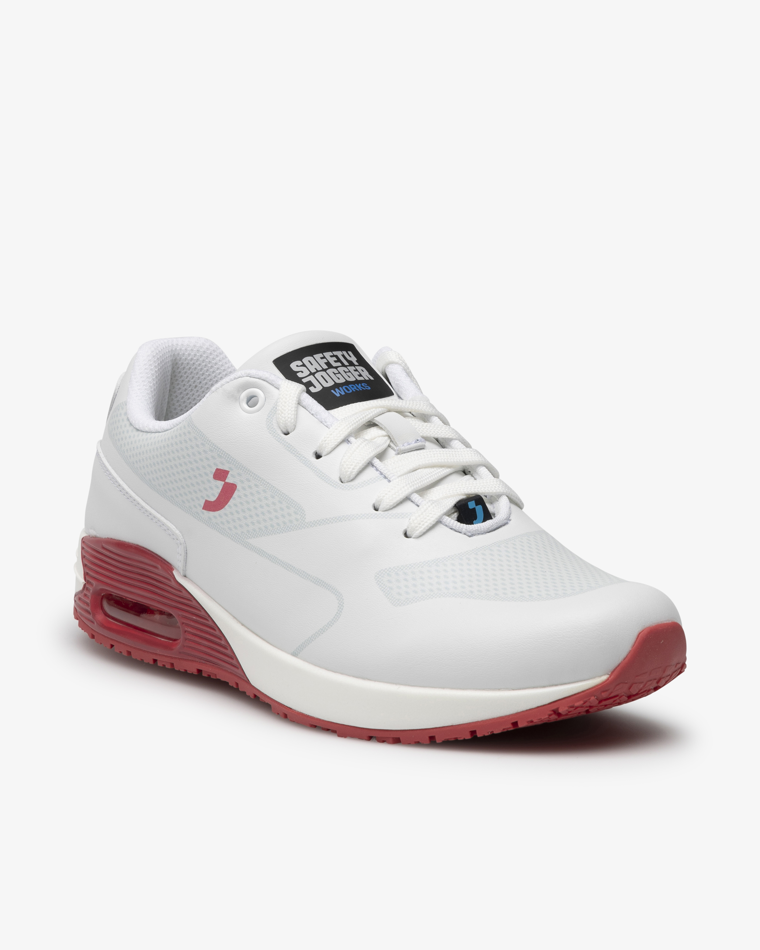 Sporty og trendy joggesko med dempende funksjon gjør joggeskoen til et opplagt valg. De har ESD-teknologi for å beskytte mot elektroniske skader og antennelsesrisiko. Den uttagbare fotsengen og innersålen i memoryskum gir uovertruffen komfort og kan byttes ut med spesialtilpassede innleggssåler for personlig støtte. Joggeskoen gir godt grep på flere underlag. Skoene egner seg for både tørre og glatte miljøer og er veganske.