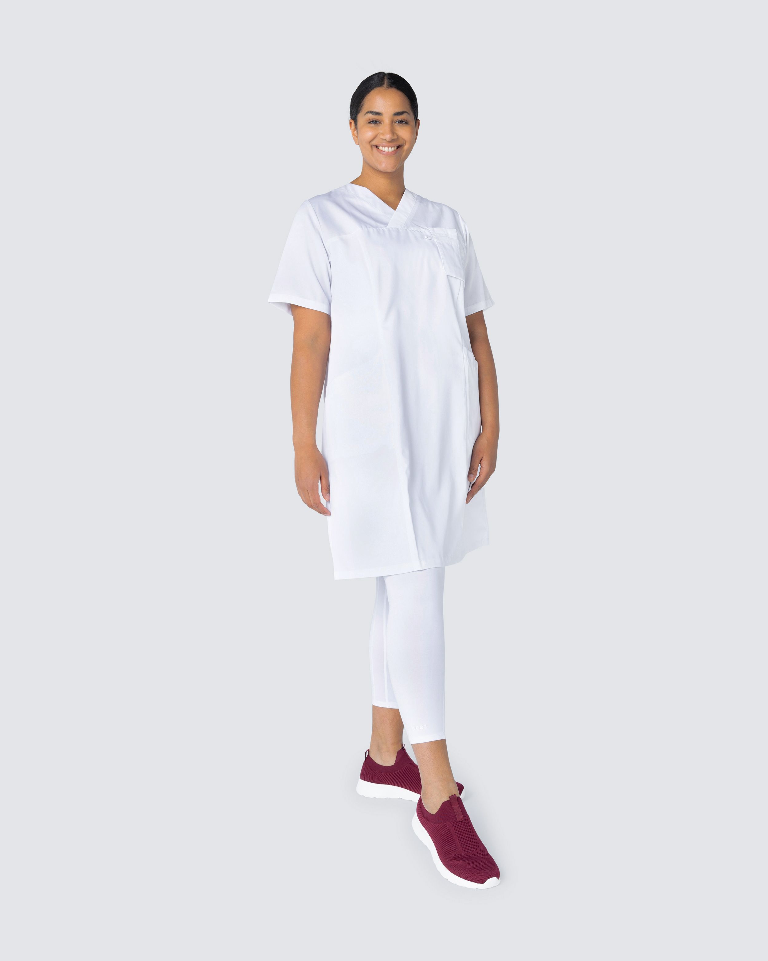Komfortabel pleiekjole i miljøvennlig Tencel. Tencel er et materiale som gir en lett og behagelig følelse, puster godt og har høy komfort - perfekt for deg i helsevesenet med lange og varme arbeidsøkter. Arbeidskjolen har to romslige sidelommer og en brystlomme. V-hals og litt skreddersydd for en fin passform.