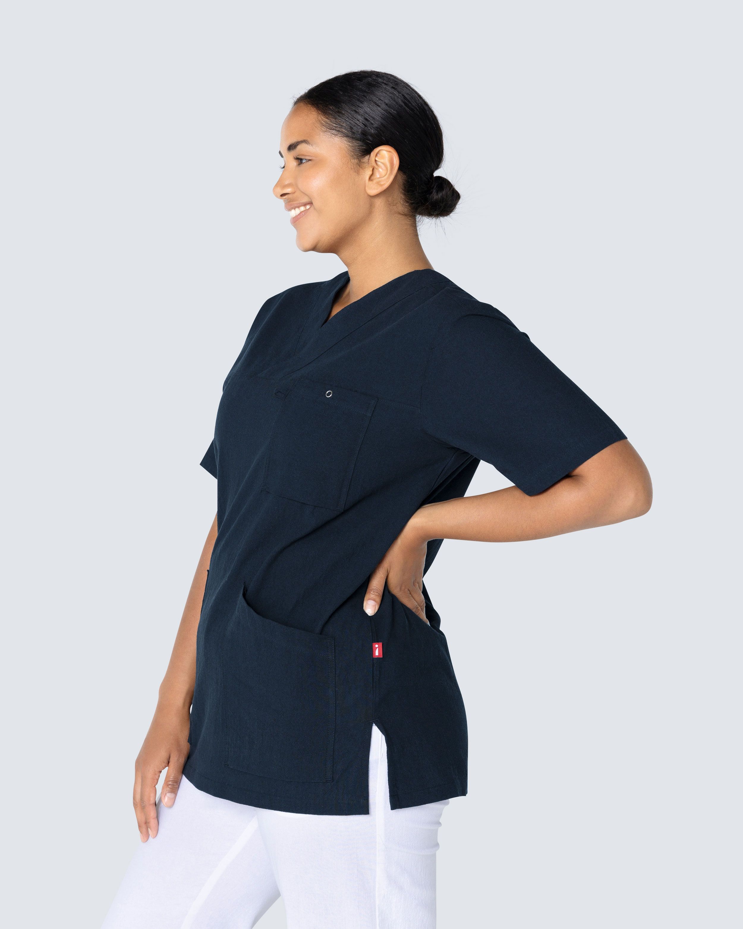 Komfortabel kittel i krinklet bomull med en passform som fungerer for både kvinner og menn. South Wests kittel i krinklet bomull har en veldig myk komfort, høy pusteevne og et luftig design som gir maksimal bevegelsesfrihet. kitlen har en klassisk V-hals og en rett passform med sjenerøse mål som passer til de fleste kroppstyper. Med to romslige sidelommer, hvorav den ene er utstyrt med nøkkelholder og telefonlomme, og en brystlomme med trykknapp, har du god plass til en pennelomme, saks, ID-kort og alt annet utstyr du trenger for en dag i omsorgen.