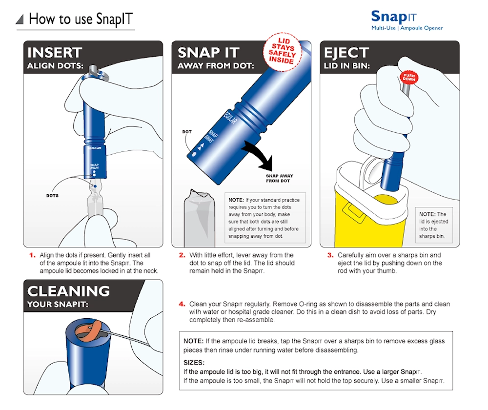 Qlicksmart SnapIT ampulleåpner Trolley Edition minimerer risikoen for kutt-skader ved åpning av ampuller. Helsevesenet bruker millioner av ampuller hvert år. Knust glass, glasskår og ødelagt innhold har alltid vært et sikkerhetsproblem som resulterer i ubrukbart material. Snap-it skall forhindre dette og hjelpe deg å holde fingrene unna skarpe kanter og knust glass. Produktet er tilvirket av aluminium i høy kvalitet som kan autoklaveres hvilket gir fullstendig beskyttelse mot glassampullskader. SnapIT Trolley Edition har en flat side for å forhindre att den ruller og faller av bord eller vogner. SnapIT Trolley Edition finnes i flere størrelser for att passe de fleste ampuller. SnapIT er designet for flergangsbruk og gummiringen O-Ring ved åpningen er enkel att skifte ut efter slitasje.
