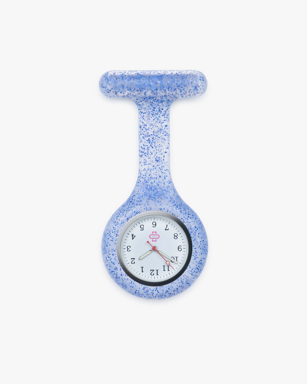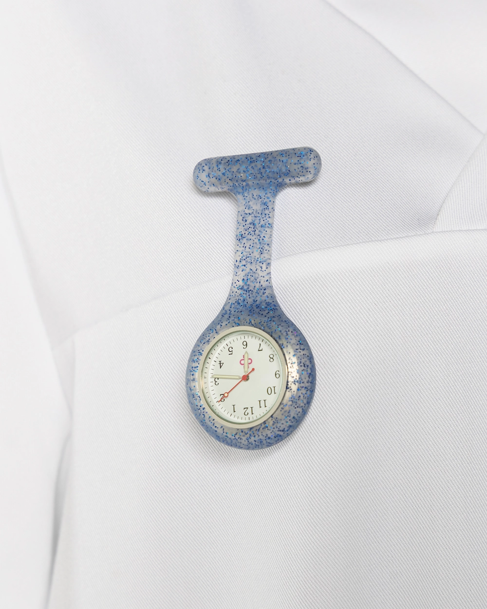 Sykepleierklokken festes enkelt på ønsket plagg med hjelp av en sikkerhetsnål. Klokkens skall er i silikon, noe som gjør det til en perfekt og hygenisk alternativ for deg som jobber i helsetjenesten,