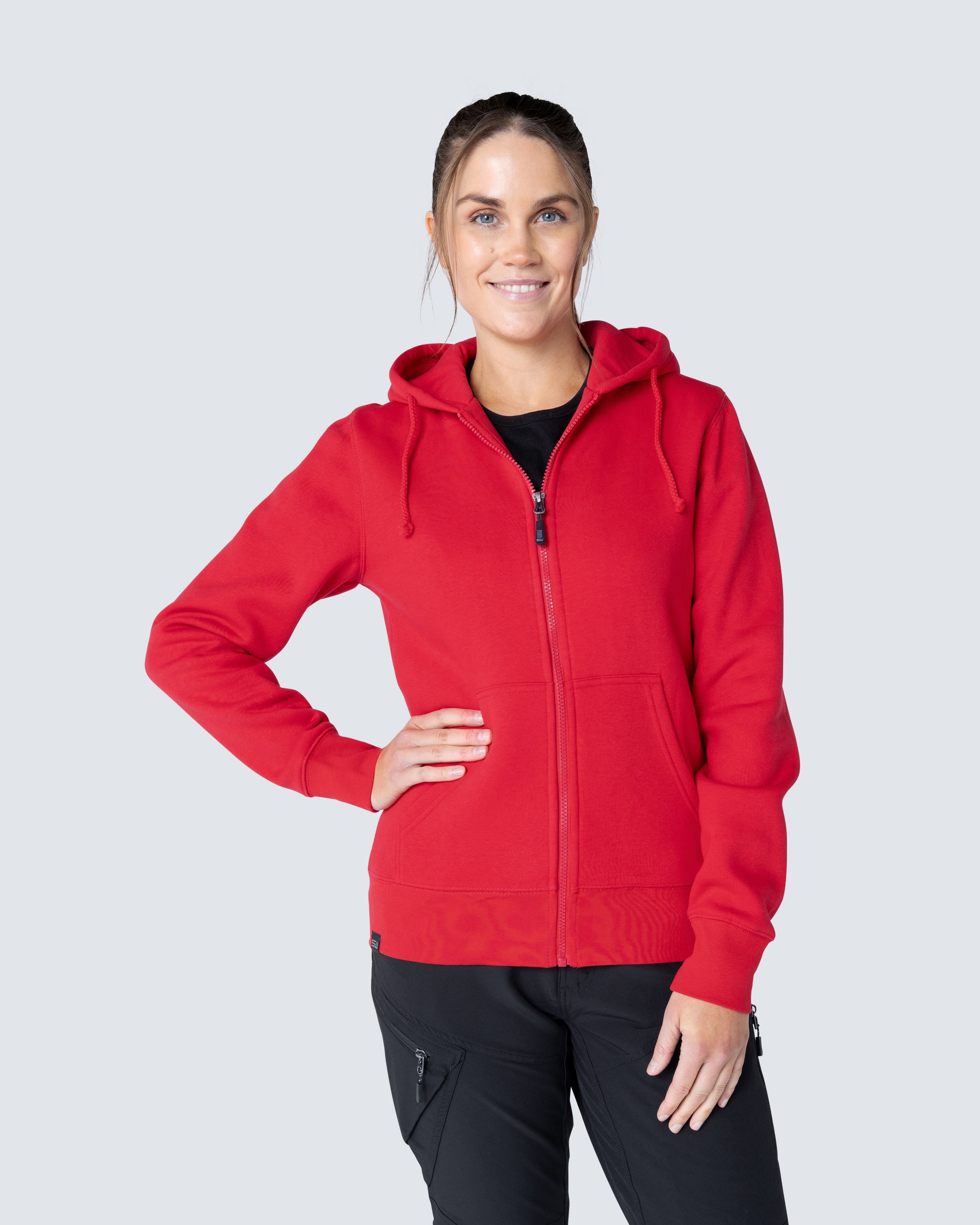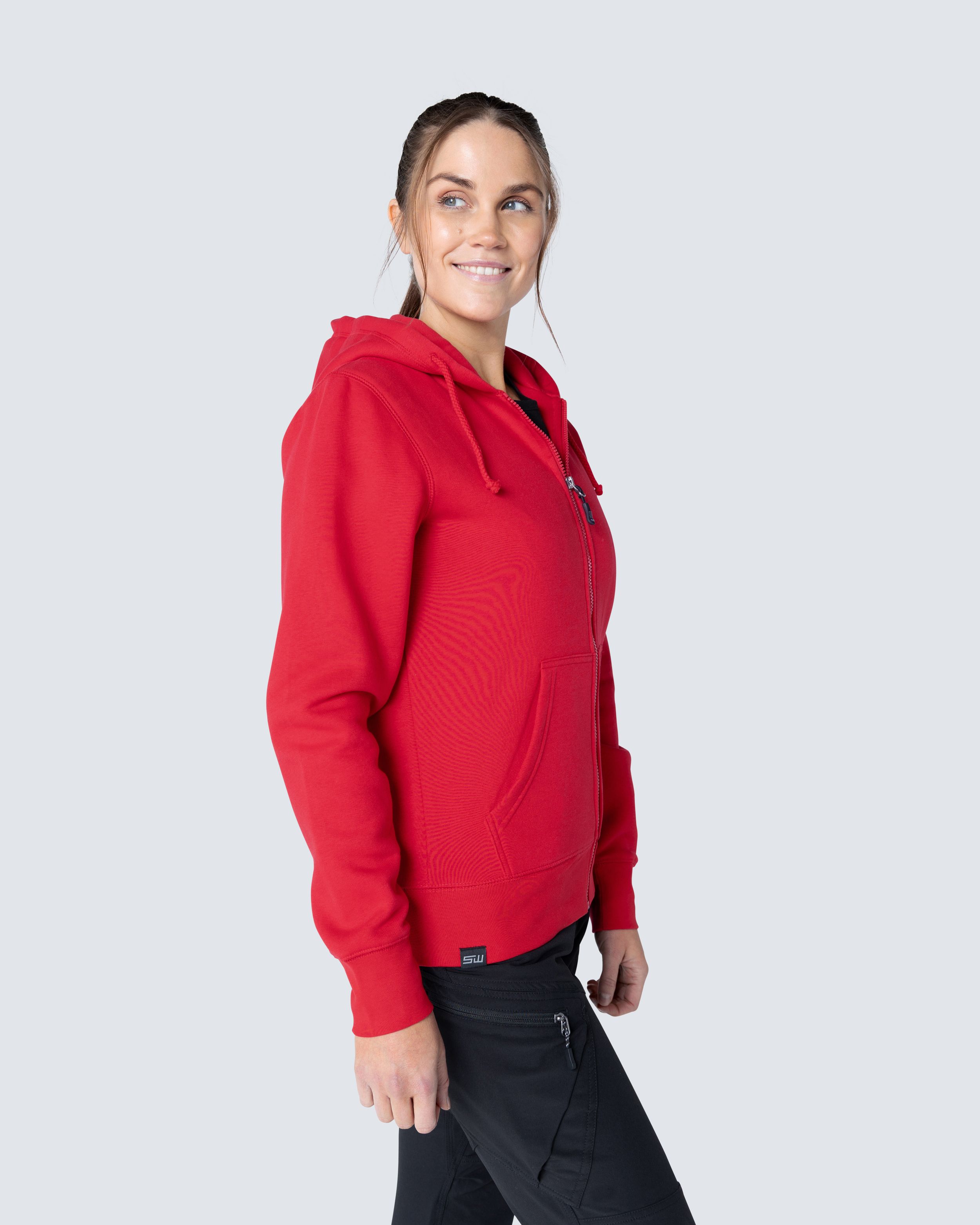 Collegejakke med fin damepassform. Dobbelt stofflag i hetten og to frontlommer. Elastisk kant nederst og vide ermekanter.