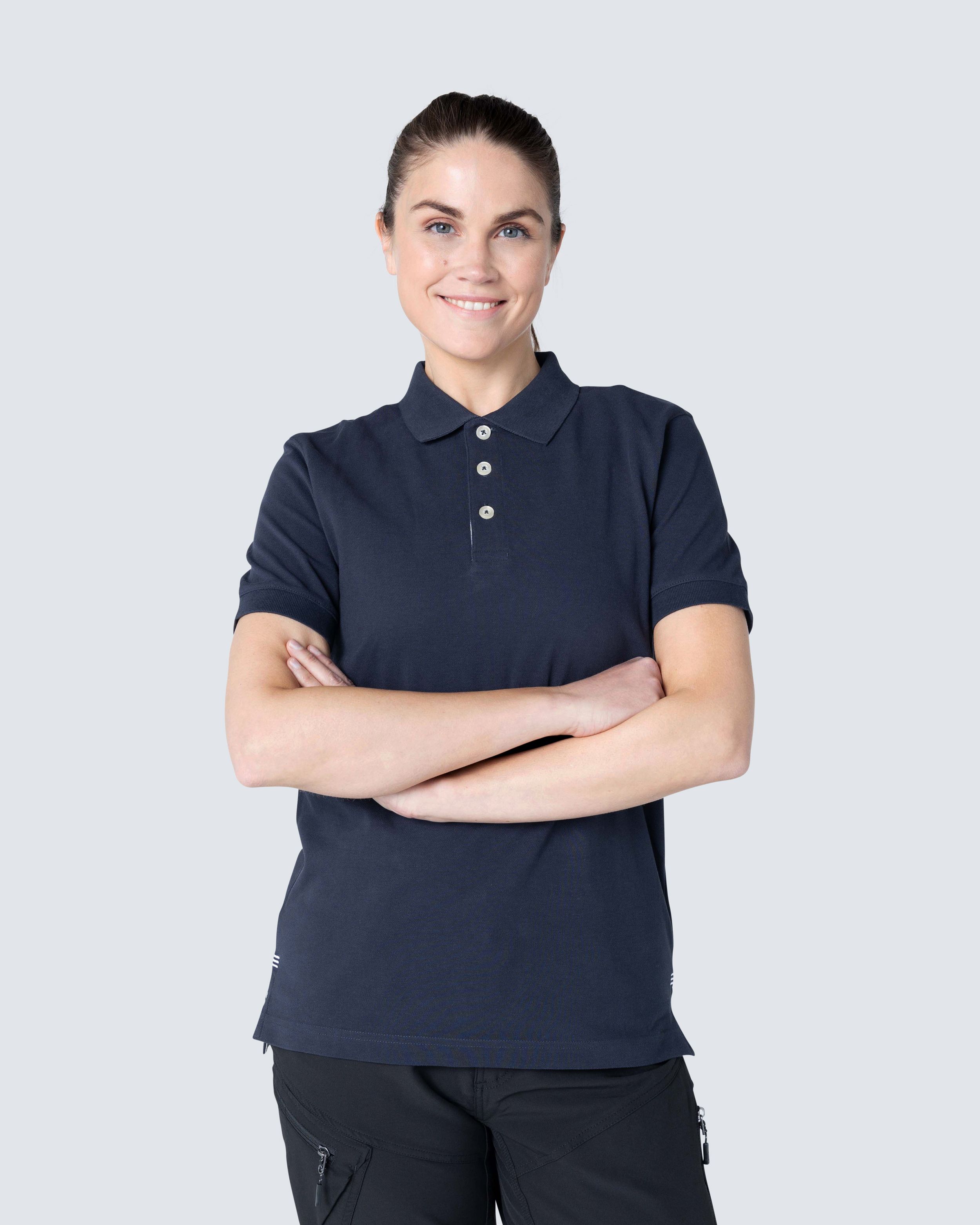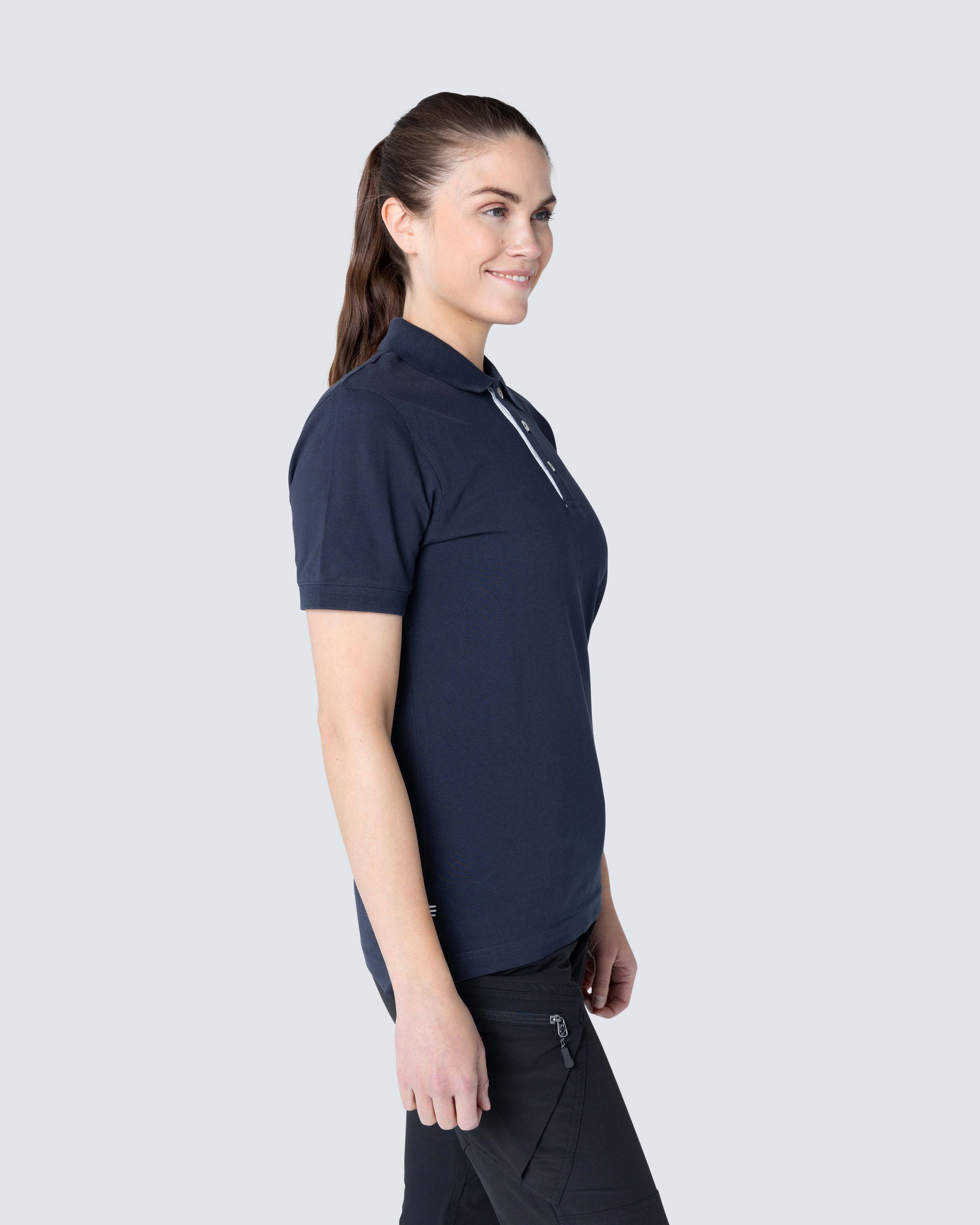 Piké med dekorativt bånd i nakke og splitt. Knappestolpen har hvite knapper og fiskebensmønster på innside i avvikende farger samt en diskret brodering som går tone-i-tone.