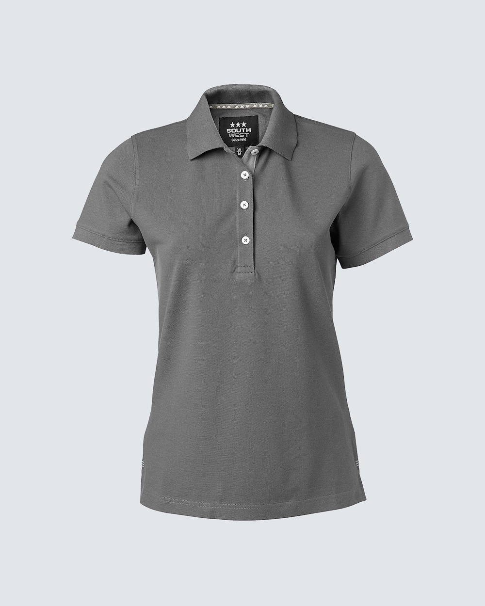 Piké med damepassform. Dekorative bånd i nakken og snittet. Halvmånsøm i nakken. Lengre knepping for et feminint utseende. Knepping med hvite knapper og fiskbensmønster på innsiden i en annen farge og en subtil brodert tone-i-ton. Broderte dyr i forskjellige farger over sprint.