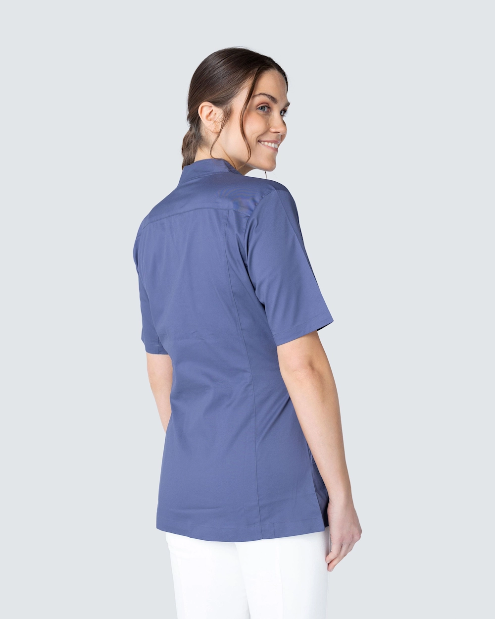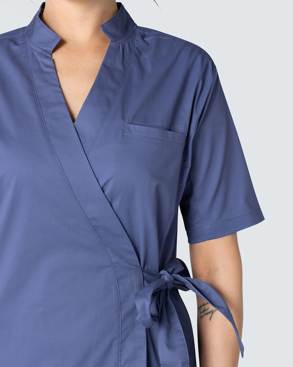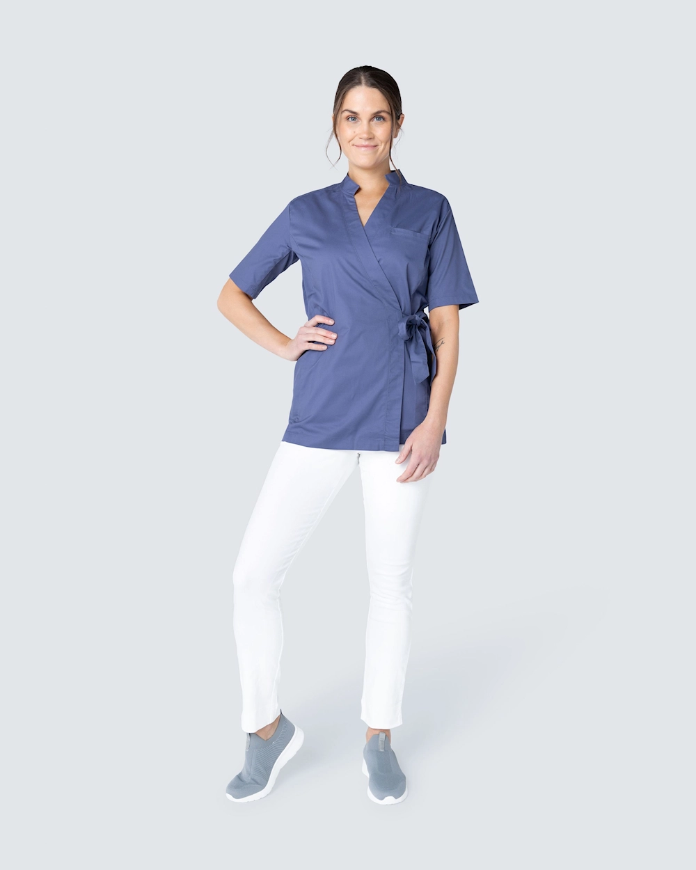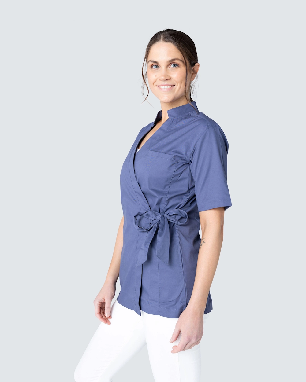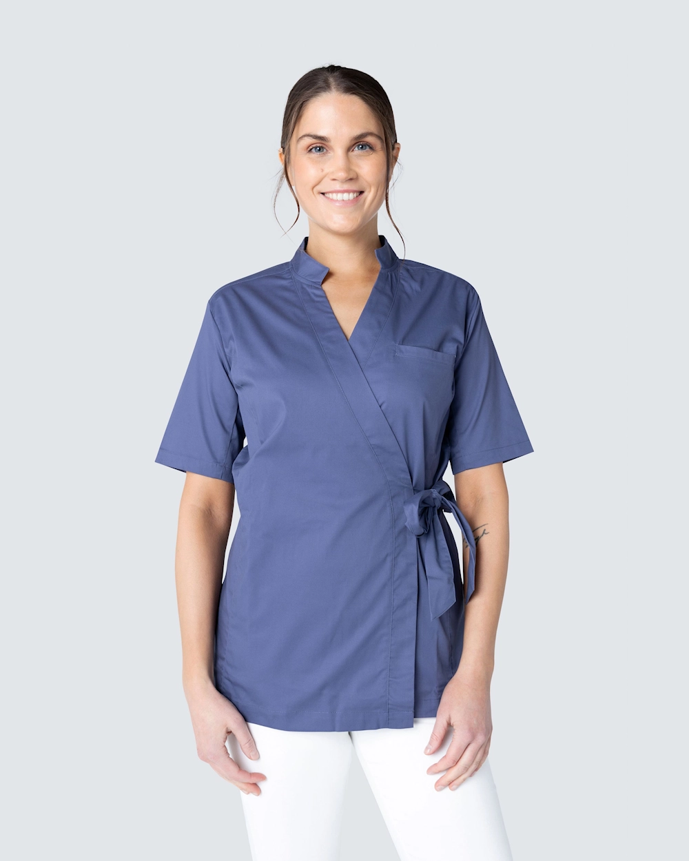 Denne tunikaen fra Wear at Work er laget av et slitesterkt og behagelig stretchstoff og knytes til en omslagsmodell med knytebånd i livet.