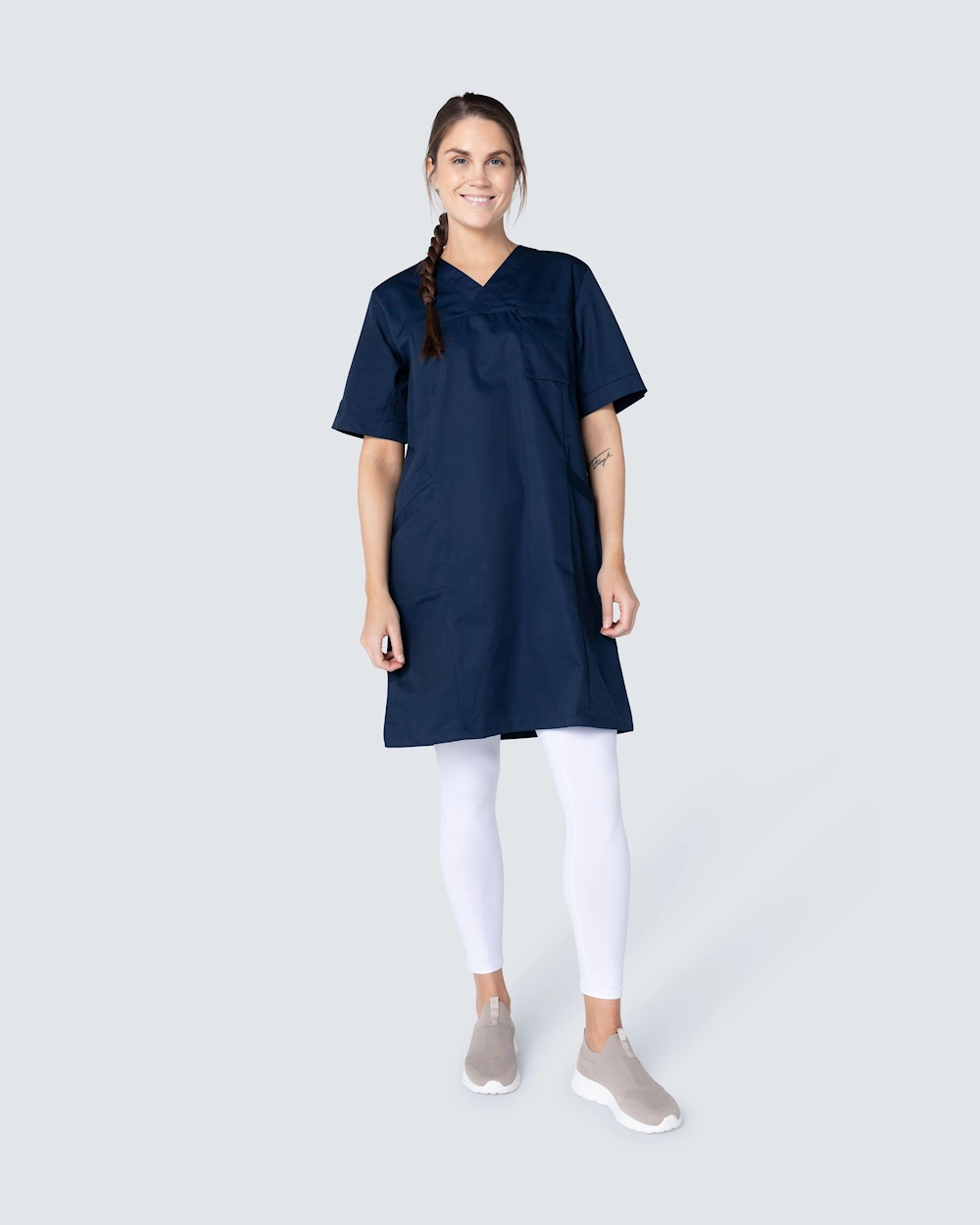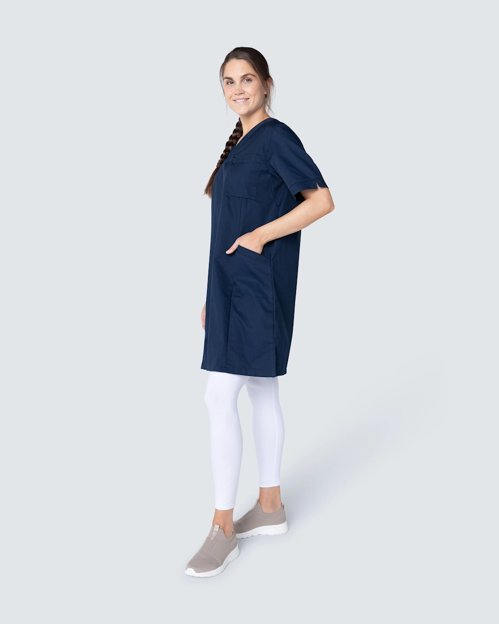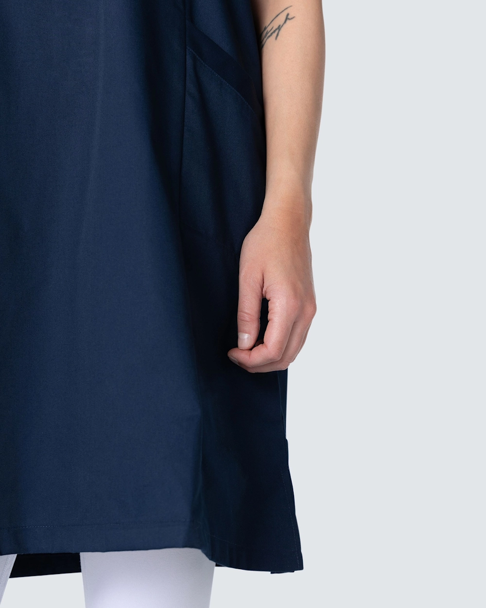 Behagelig arbeidskjole i stilrent design og slitesterkt og fargebestandig materiale som tåler vask på høy temperatur. Kjolen har V-hals, praktiske og dekorative lommer, i tillegg til en romslig passform som gir god bevegelsesfrihet. Godkjent for industrivask i henhold til ISO 15797:2018